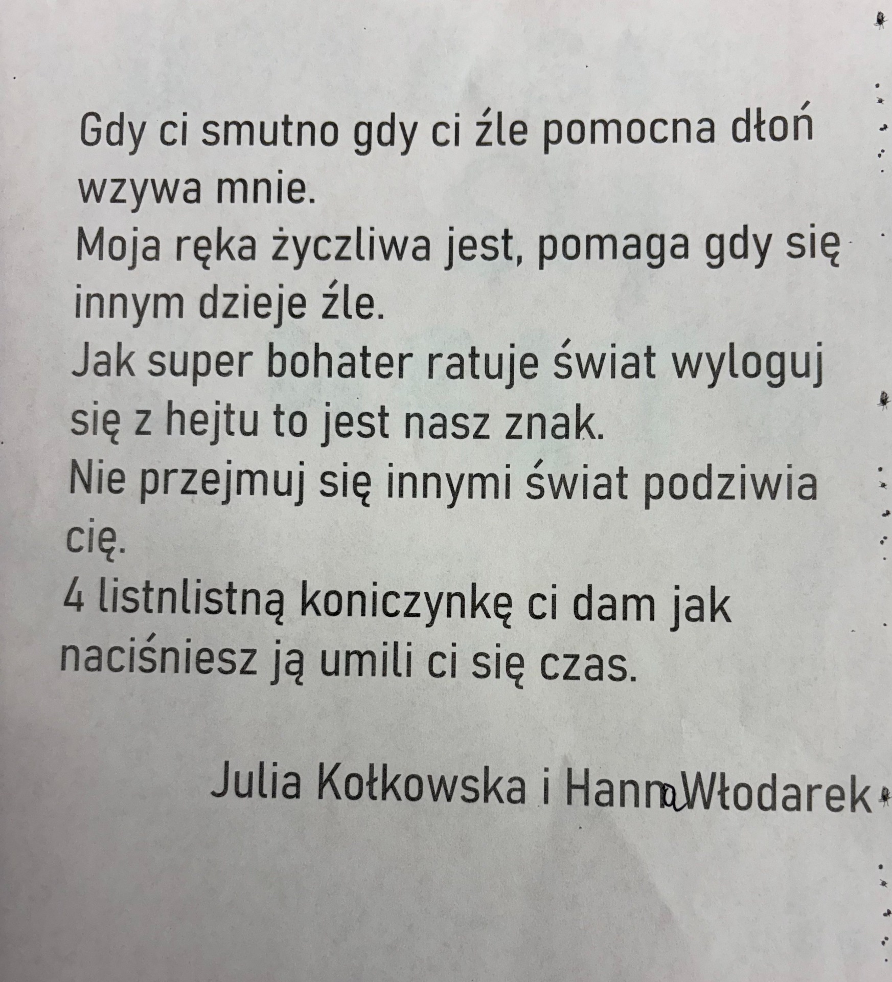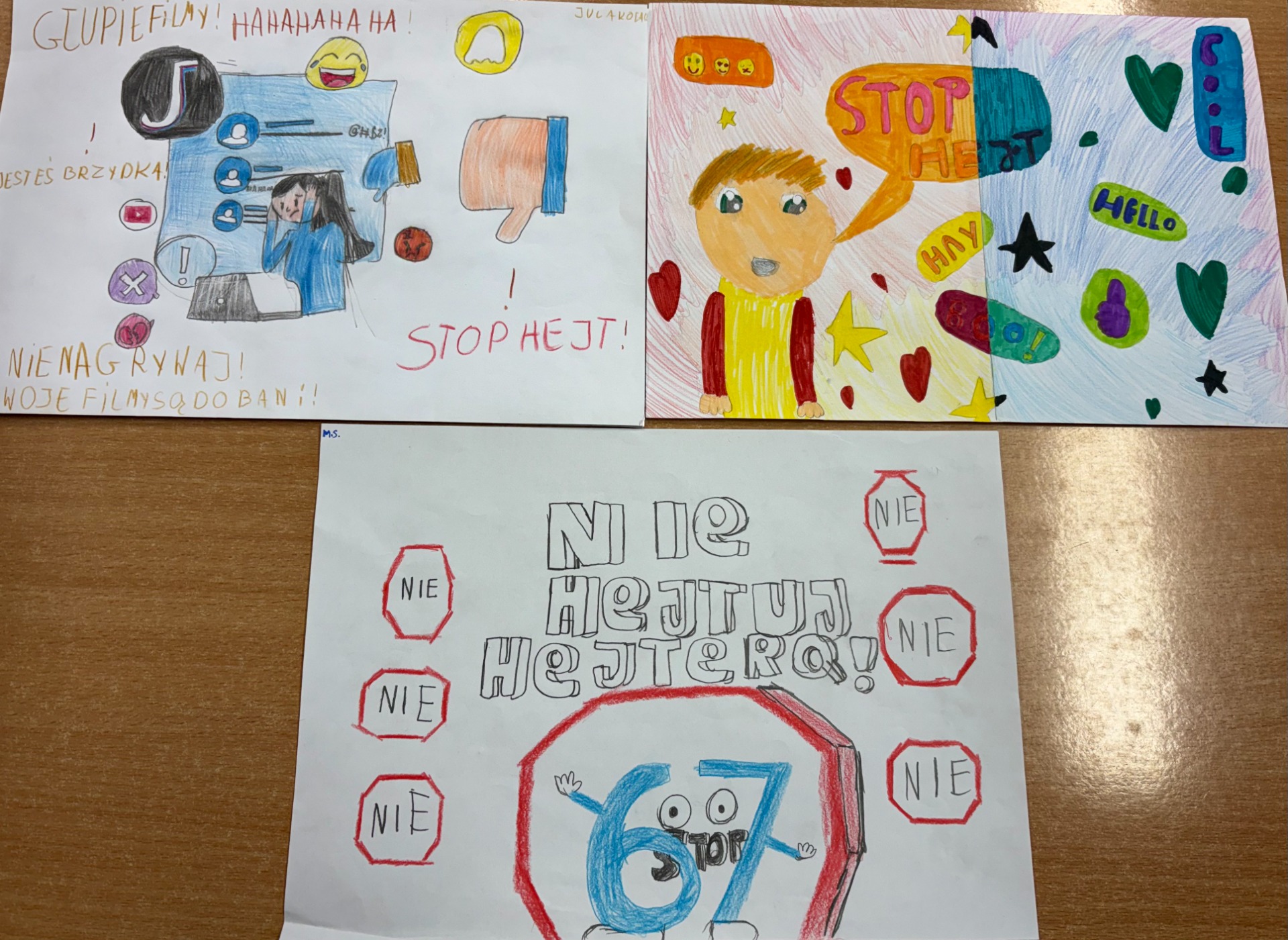 W październiku w naszej szkole prowadzone były działania związane z akcją MEN Tydzień o przeciwdziałaniu przemocy rówieśniczej. Prowadzone były warsztaty, pogadanki oraz prezentowane były filmy związane z tym tematem Jako podsumowanie tych działań ogłoszony został konkurs plastyczno - literacki- “Wyloguj się z hejtu”. W klasach 1-3 zadanie konkursowe polegało na stworzeniu plakatu, natomiast klasy 4-8 miały za zadanie napisać rymowankę. Jury w składzie- Joanna Nyklewicz, Iwona Niemiec oraz Aleksandra Sobczyk -Perz postanowiło nagrodzić następujących uczestników konkursu.