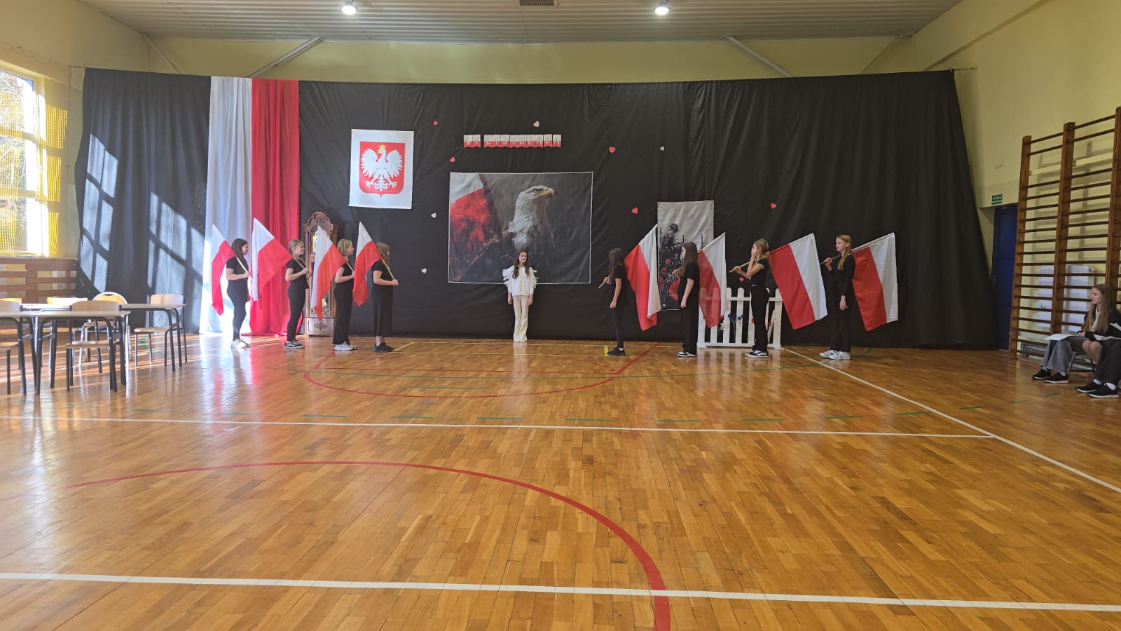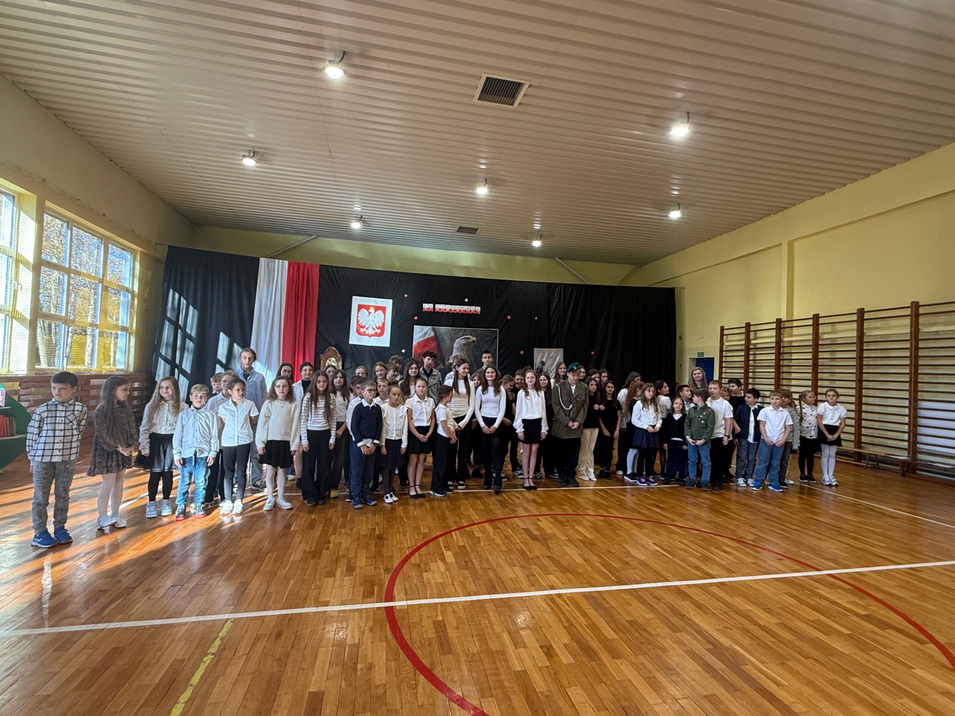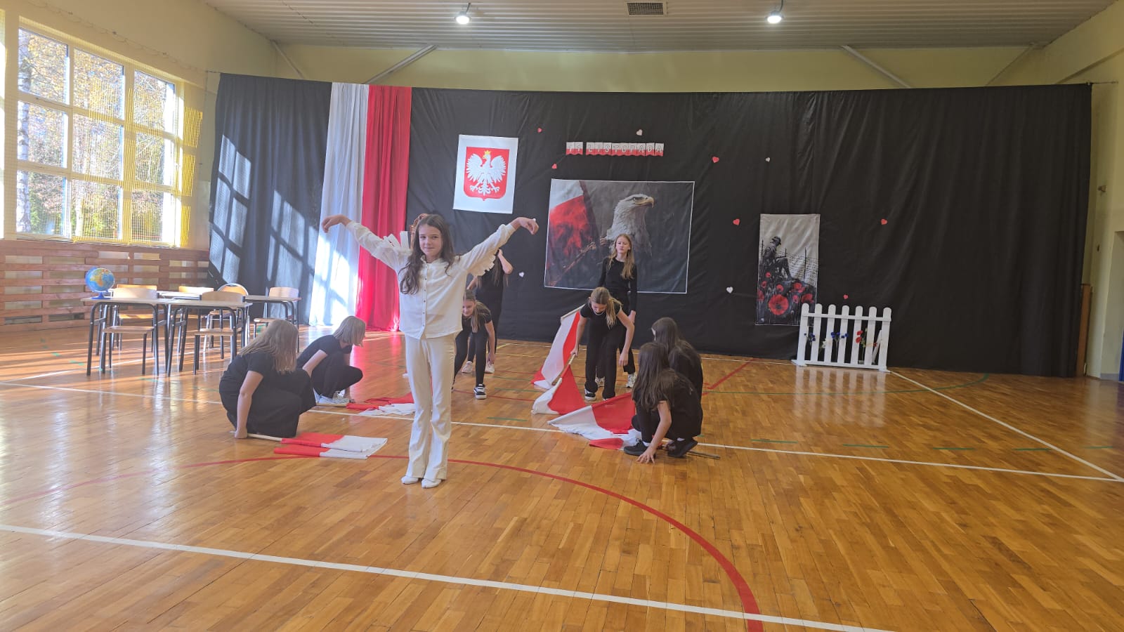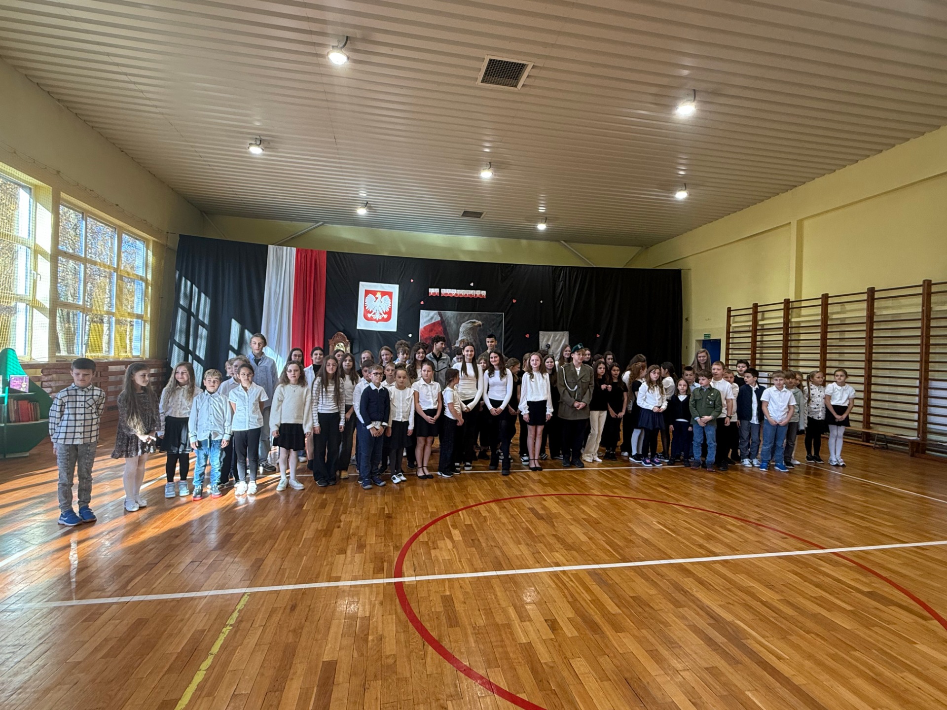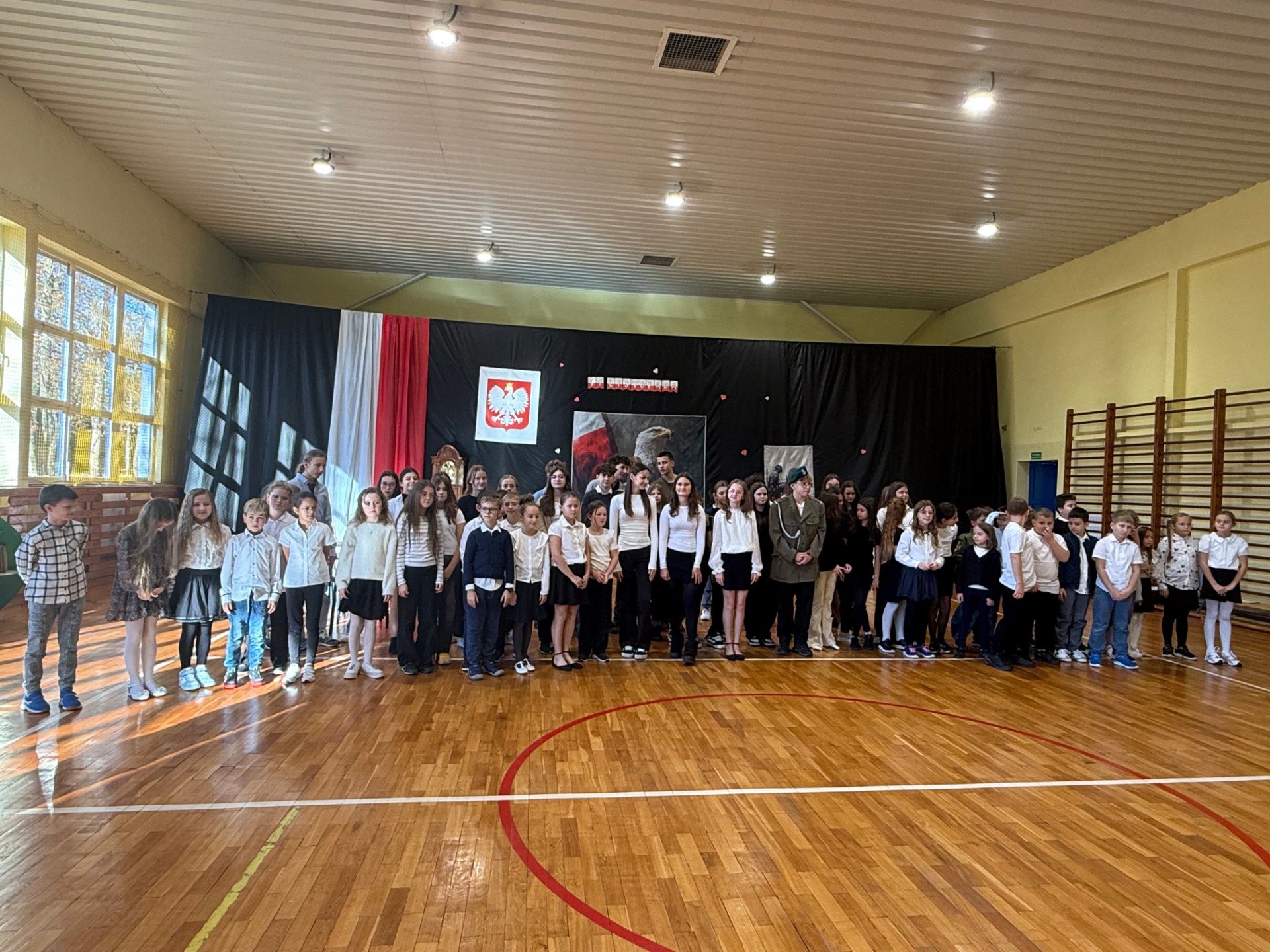 Apel uświetnił również taniec z biało-czerwonymi flagami, który symbolizował radość, nadzieję i dumę narodową. Nie zabrakło także śpiewu pieśni patriotycznych, które rozbrzmiewały w całej szkole, wprowadzając wszystkich w wyjątkowy nastrój wspólnego świętowania.