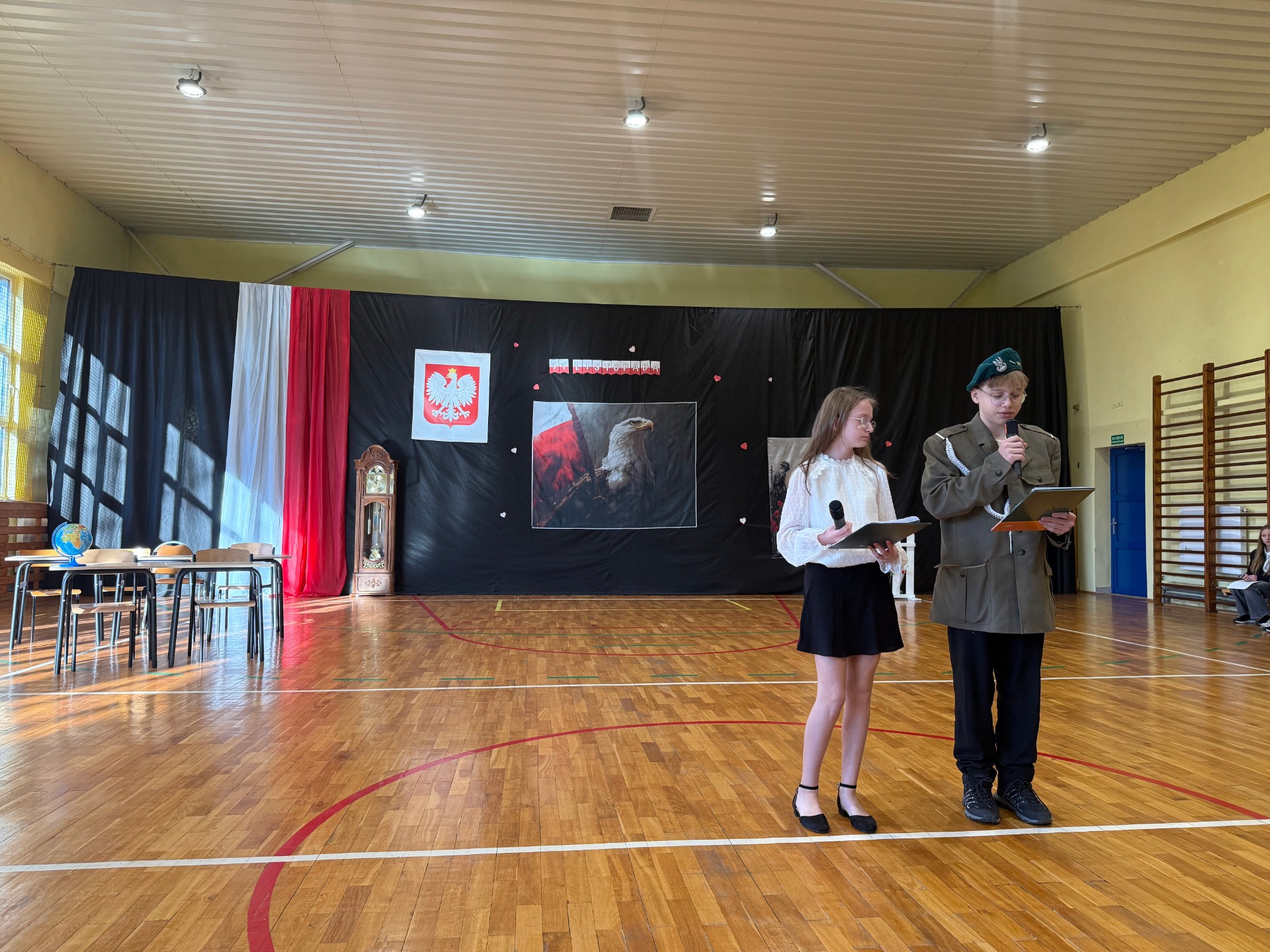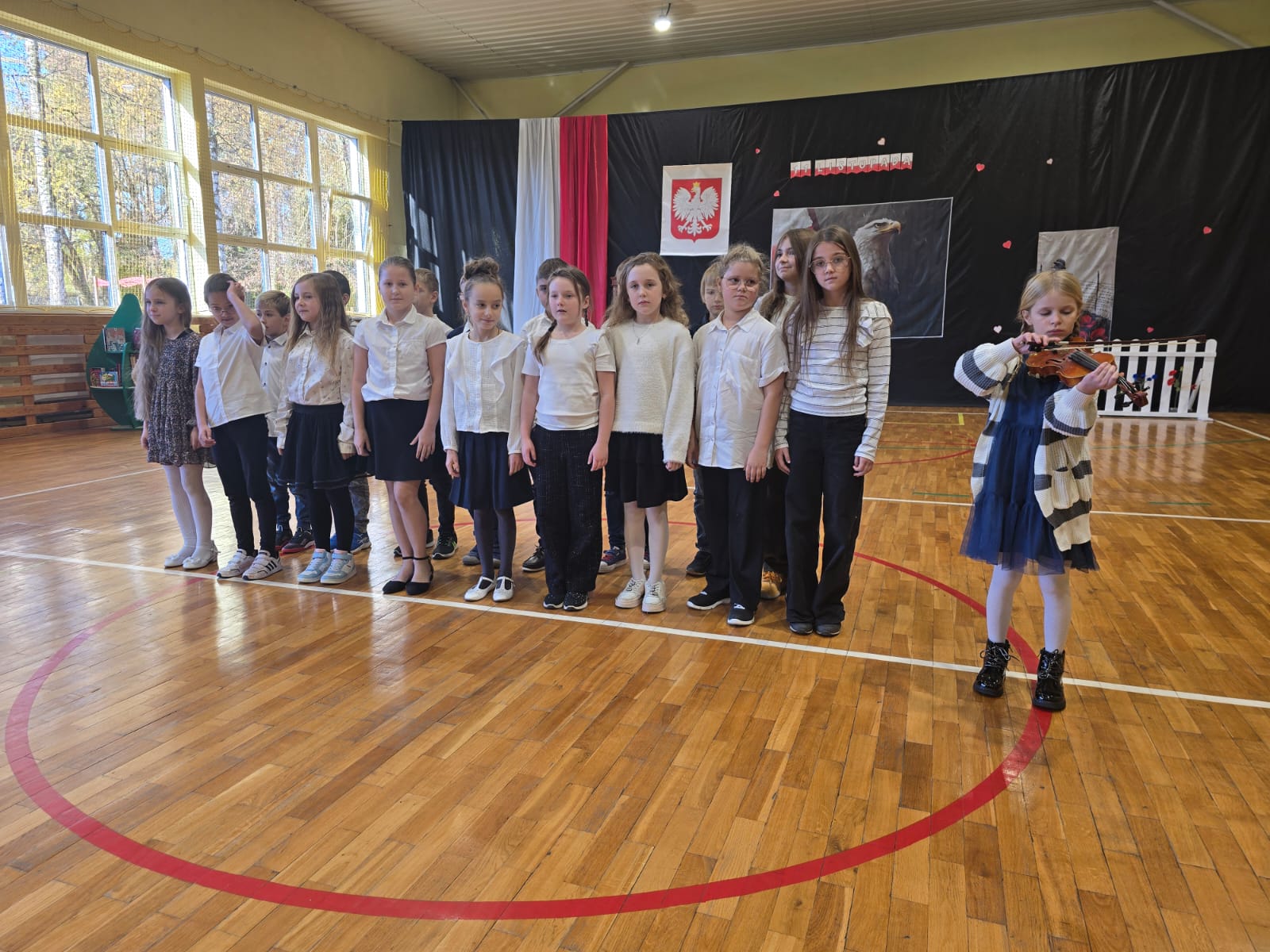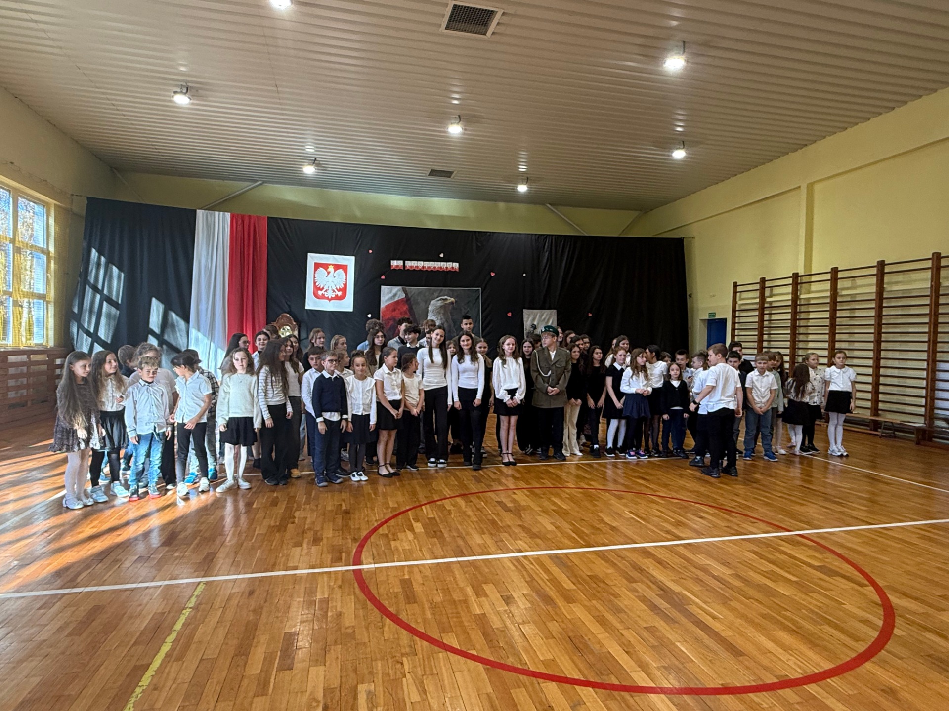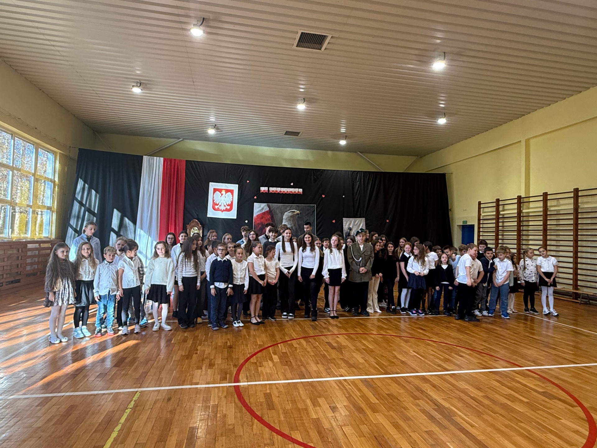 Apel uświetnił również taniec z biało-czerwonymi flagami, który symbolizował radość, nadzieję i dumę narodową. Nie zabrakło także śpiewu pieśni patriotycznych, które rozbrzmiewały w całej szkole, wprowadzając wszystkich w wyjątkowy nastrój wspólnego świętowania.