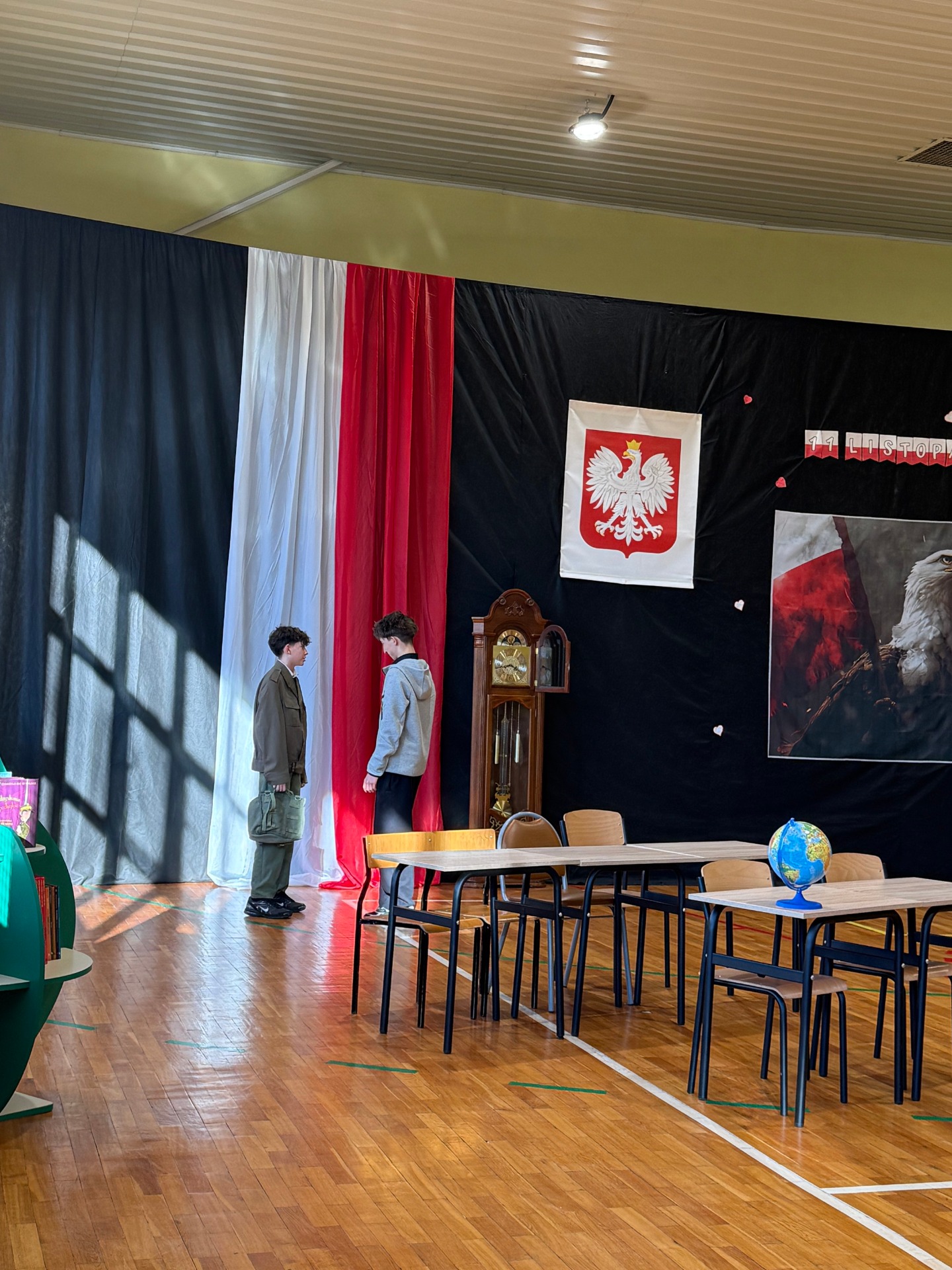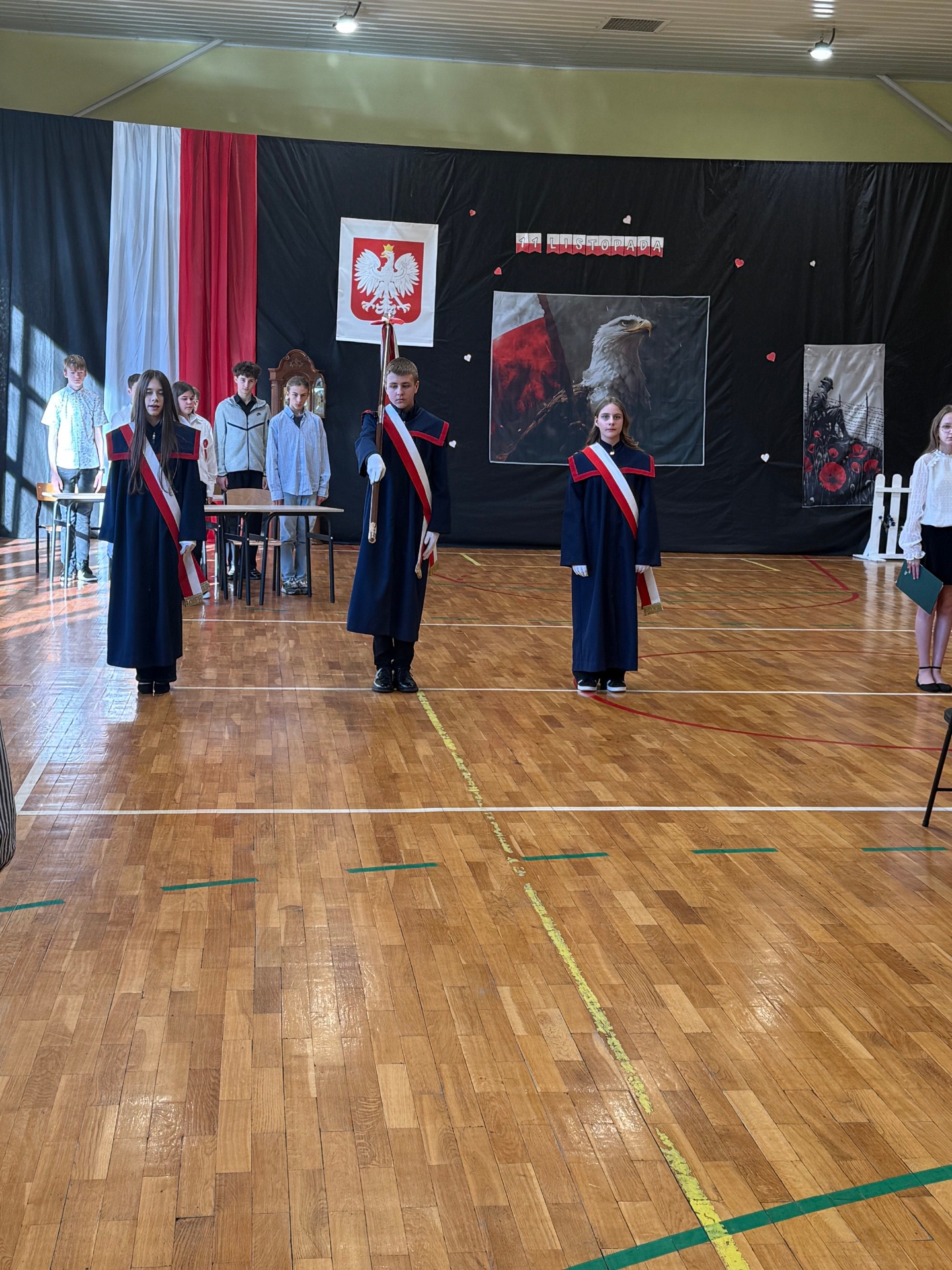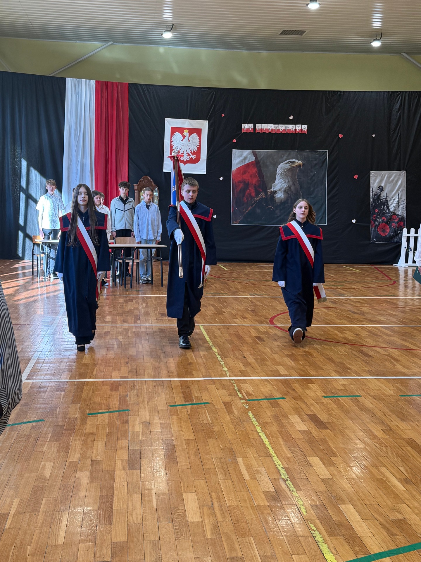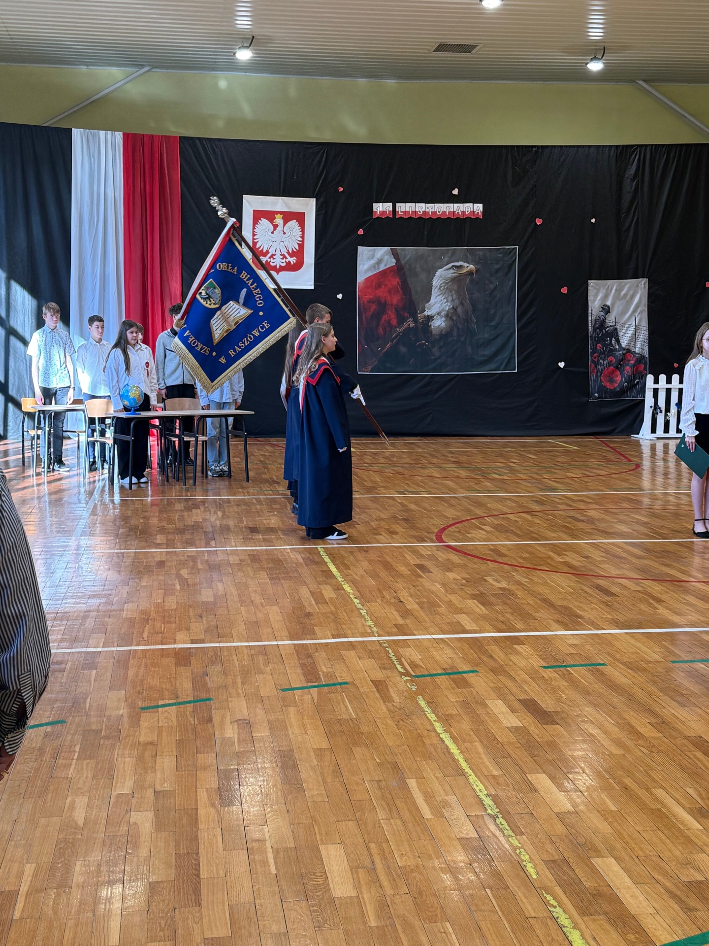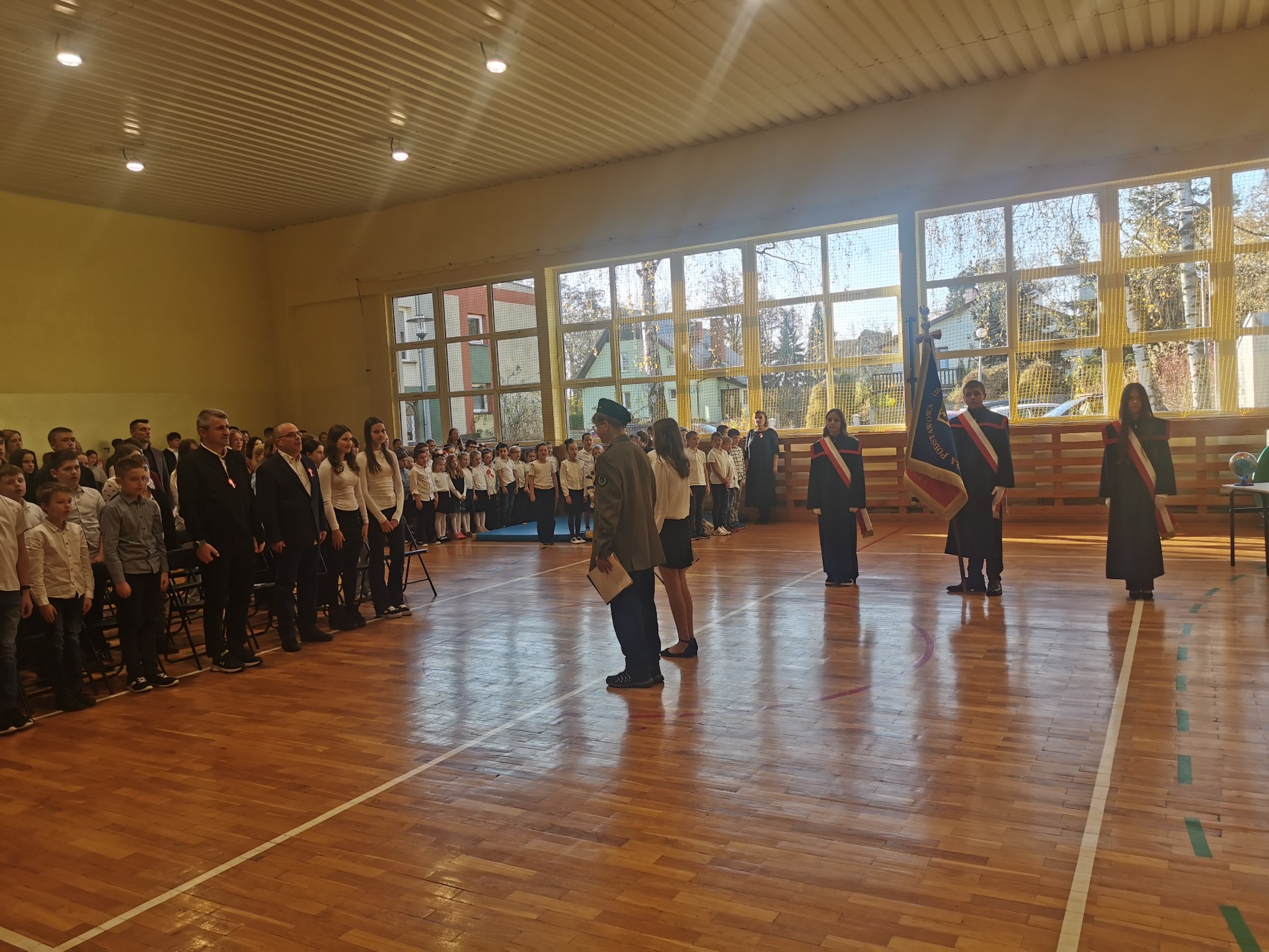 Apel uświetnił również taniec z biało-czerwonymi flagami, który symbolizował radość, nadzieję i dumę narodową. Nie zabrakło także śpiewu pieśni patriotycznych, które rozbrzmiewały w całej szkole, wprowadzając wszystkich w wyjątkowy nastrój wspólnego świętowania.