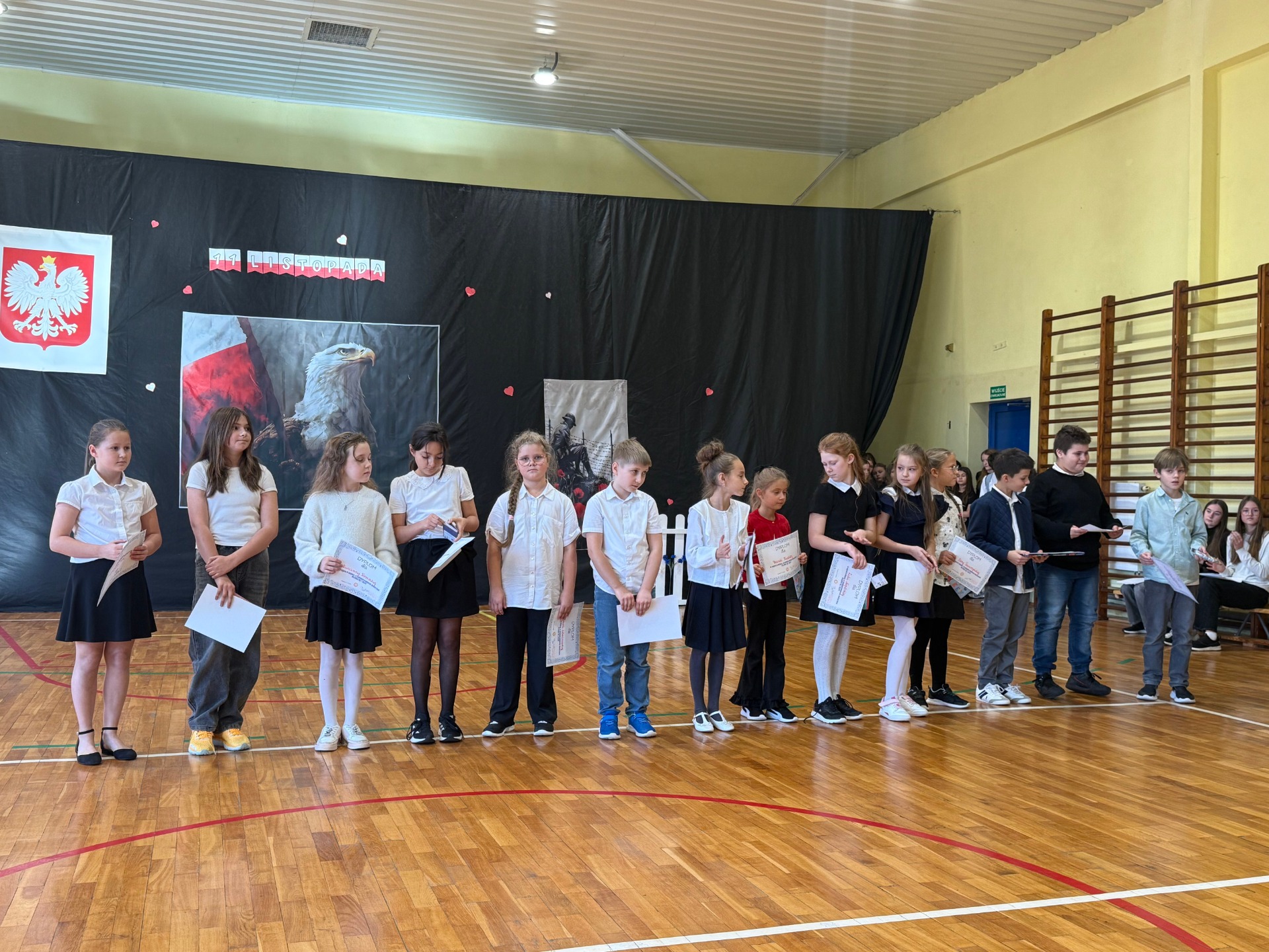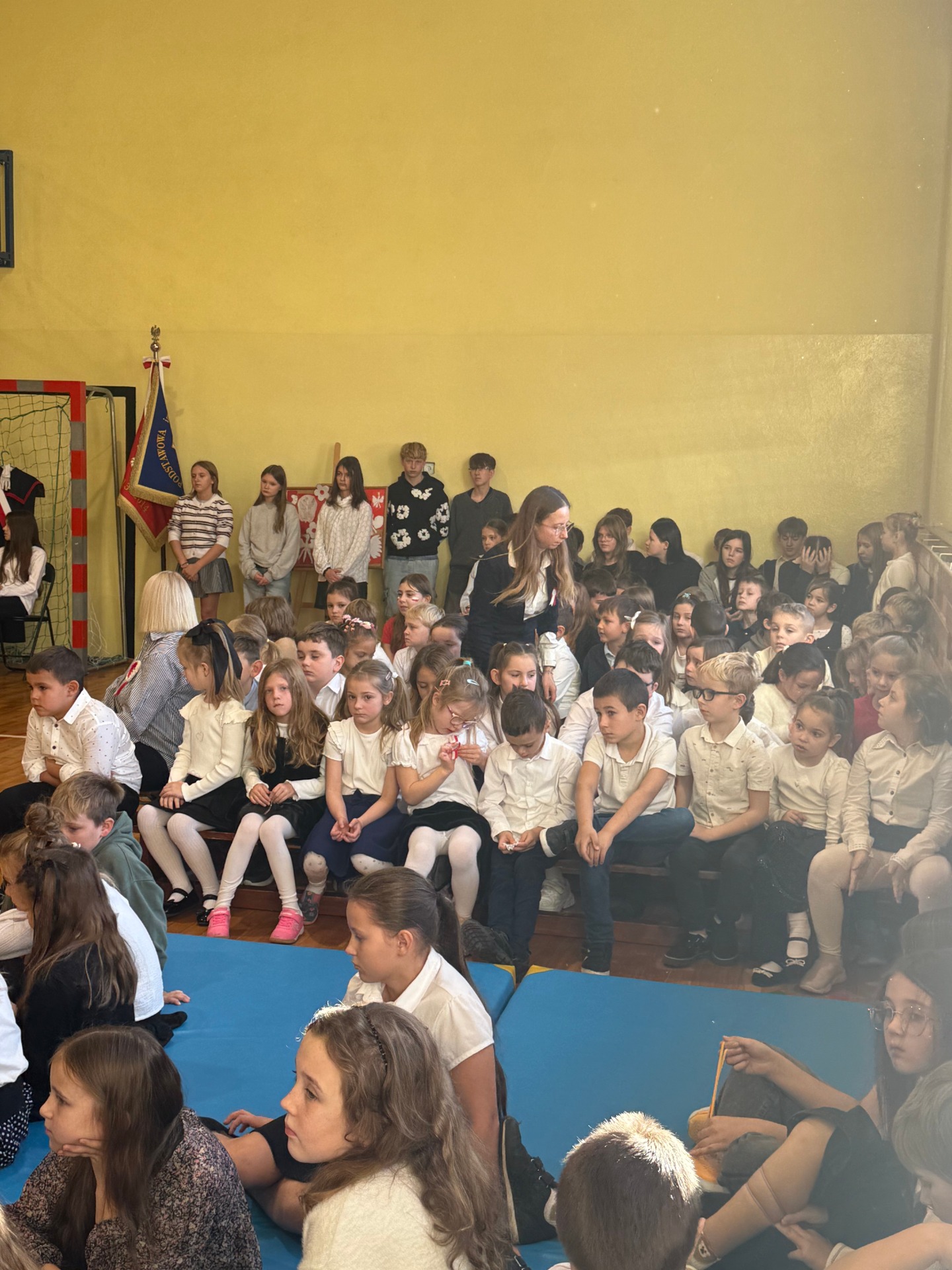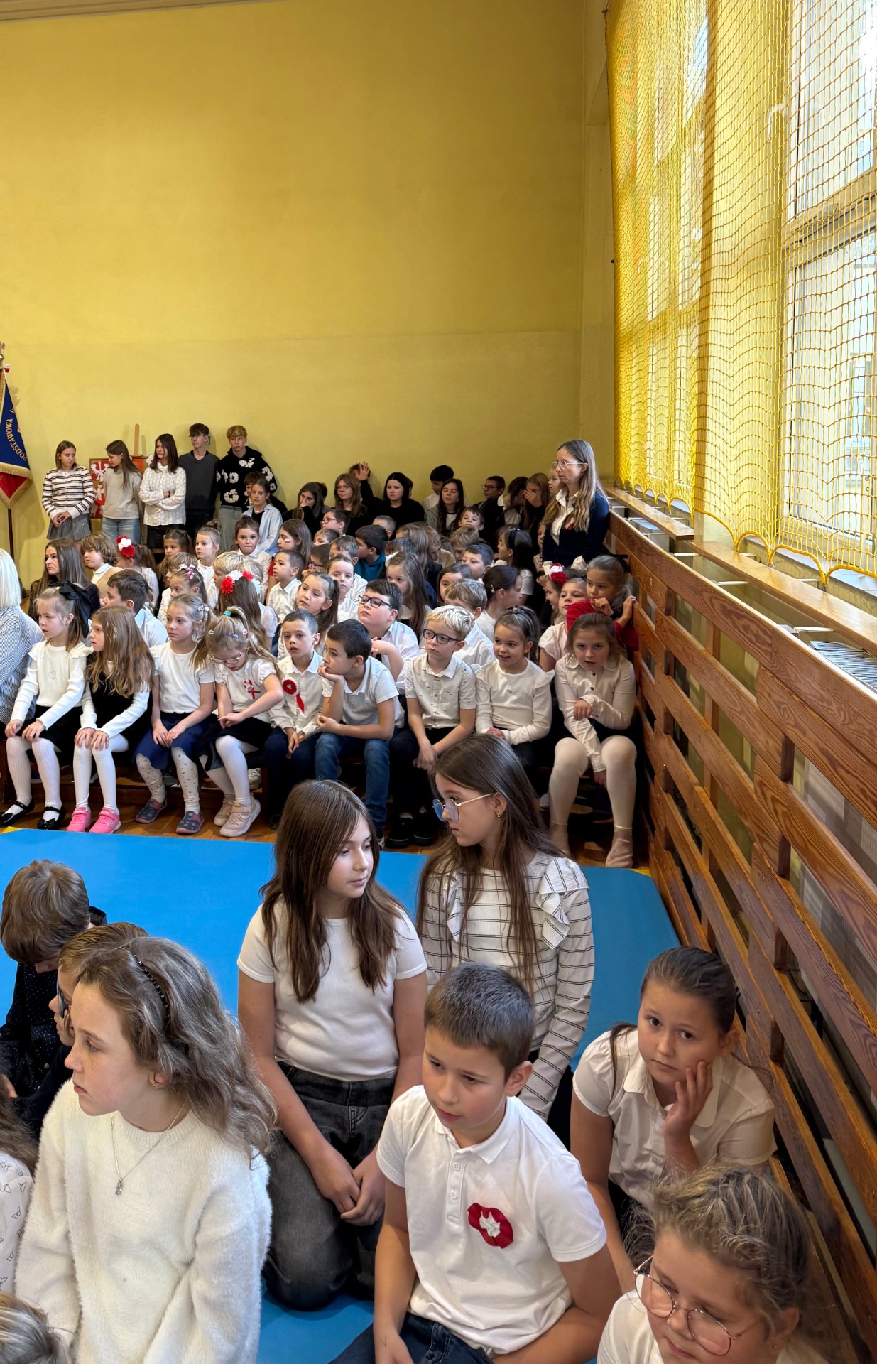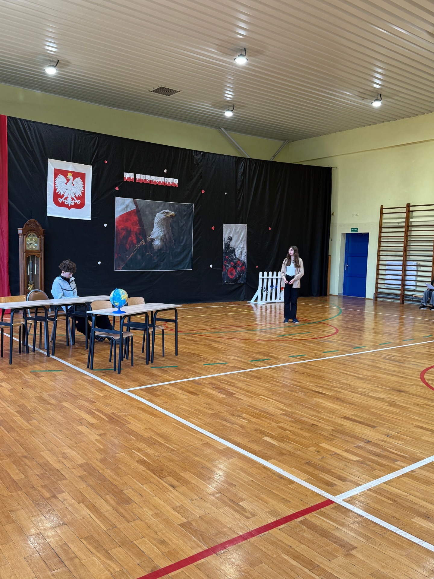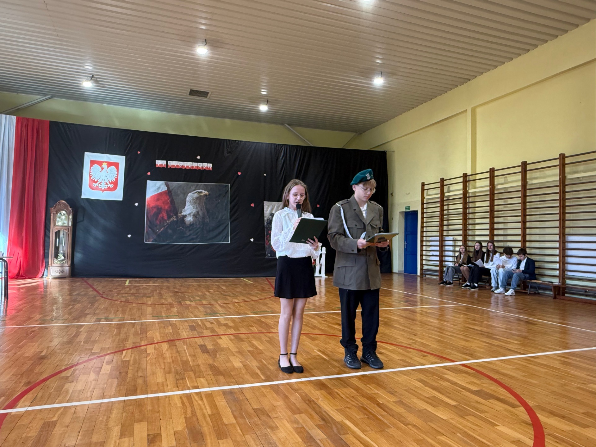 Apel uświetnił również taniec z biało-czerwonymi flagami, który symbolizował radość, nadzieję i dumę narodową. Nie zabrakło także śpiewu pieśni patriotycznych, które rozbrzmiewały w całej szkole, wprowadzając wszystkich w wyjątkowy nastrój wspólnego świętowania.