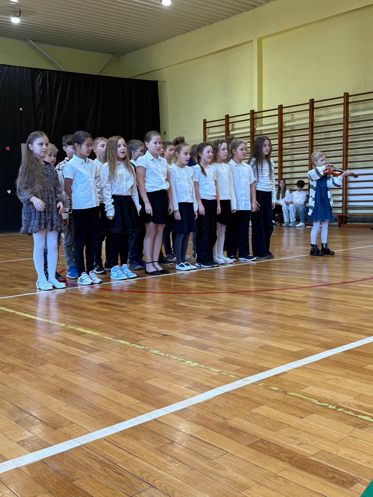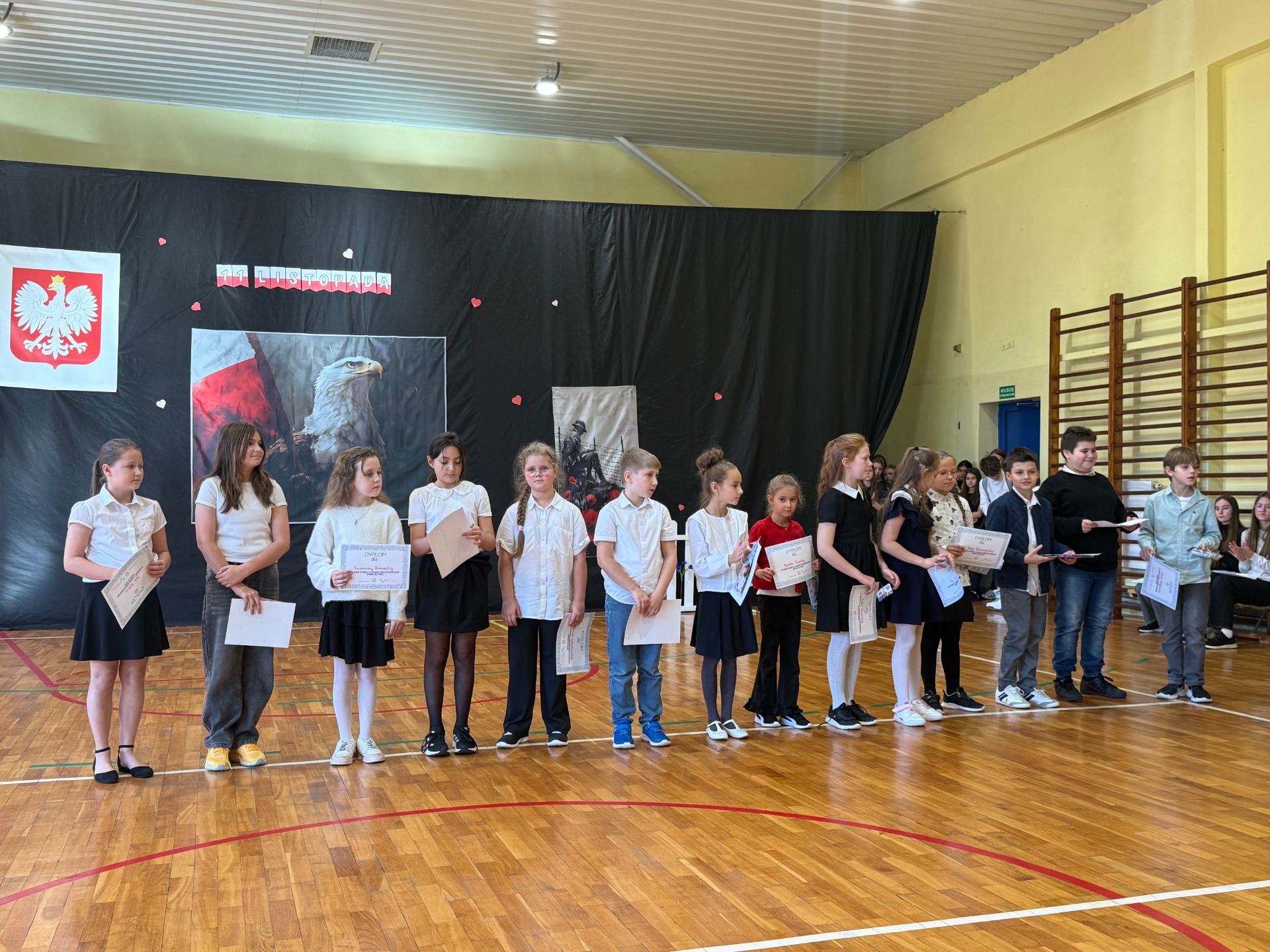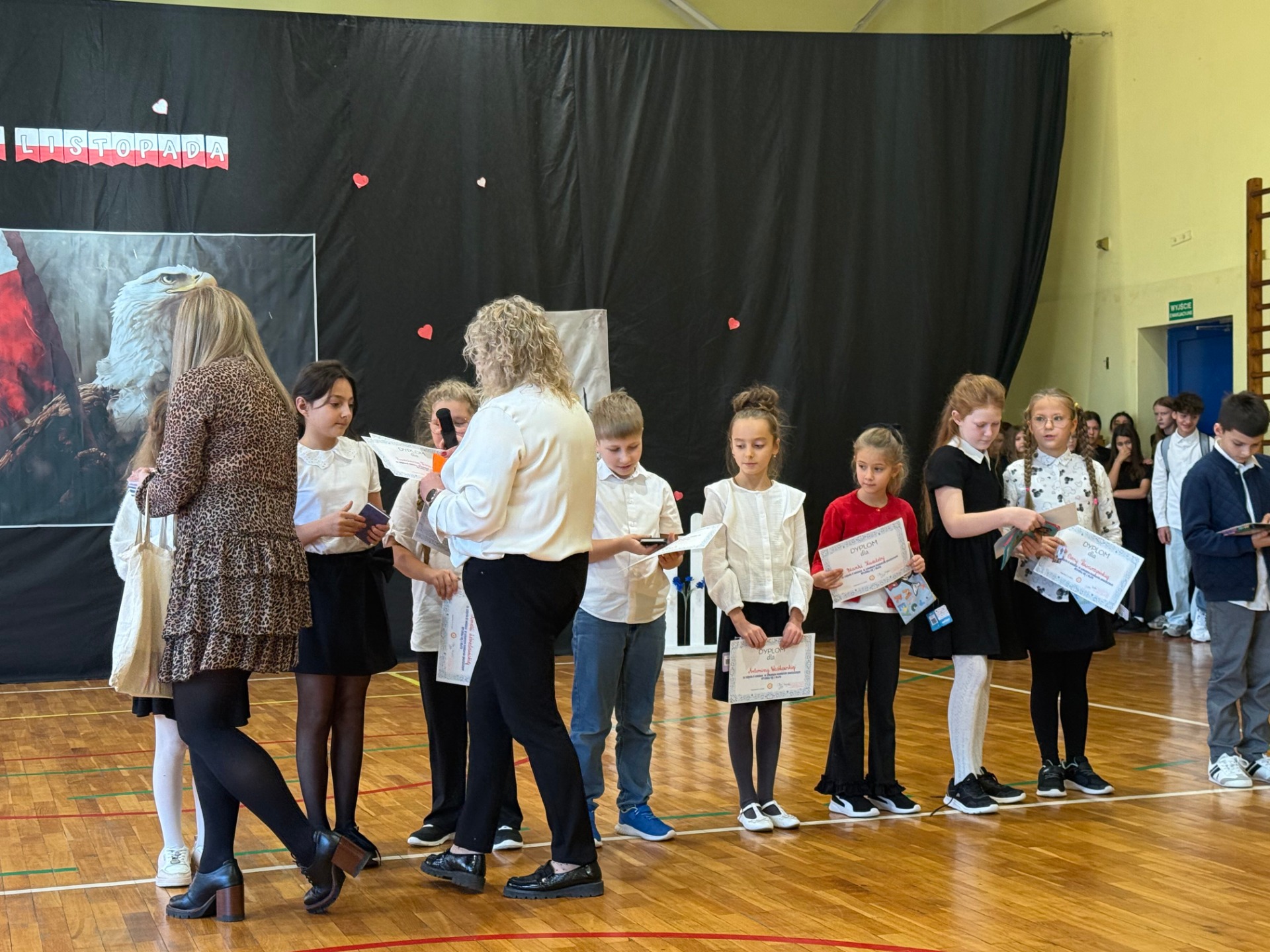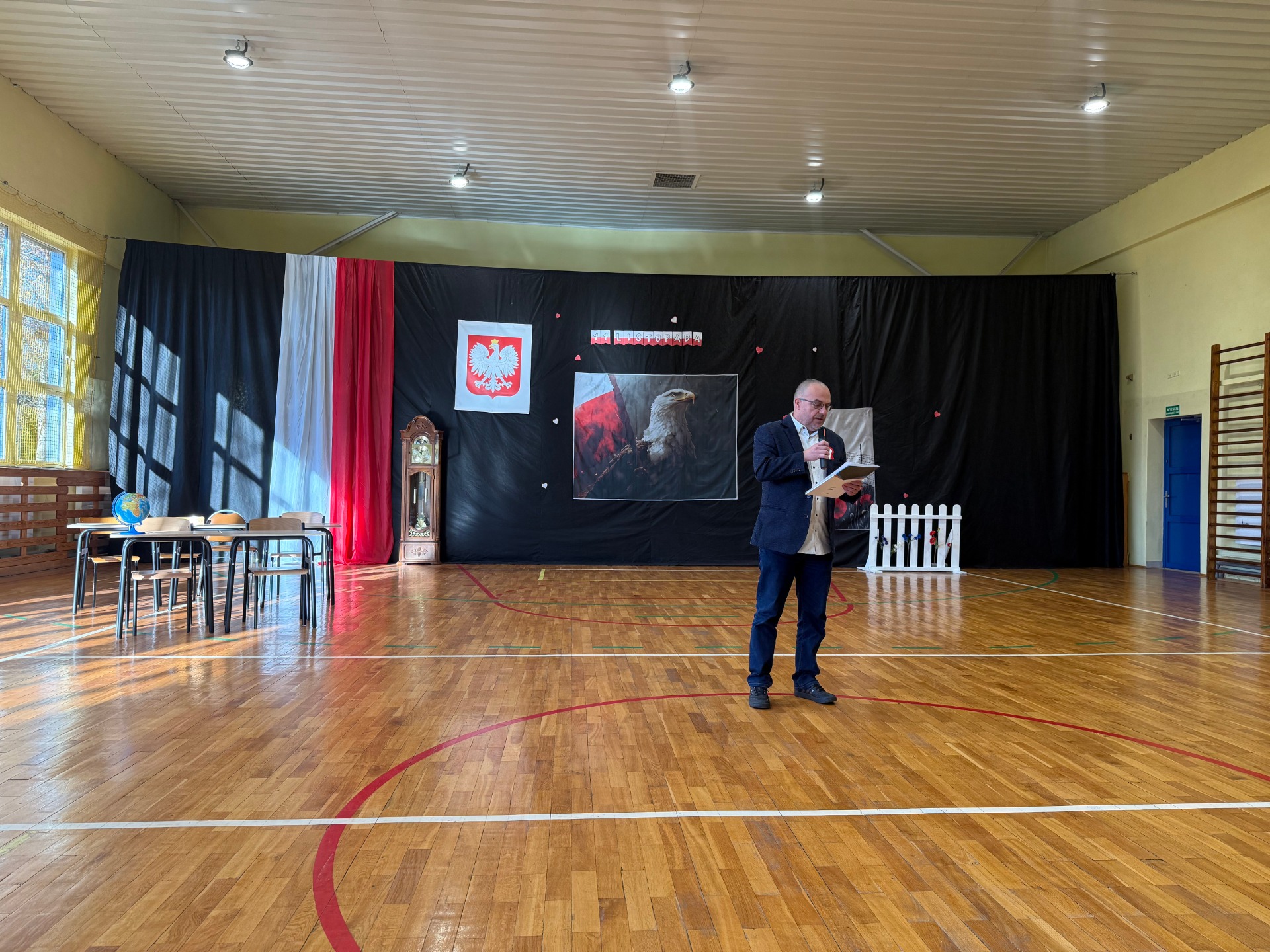 Apel uświetnił również taniec z biało-czerwonymi flagami, który symbolizował radość, nadzieję i dumę narodową. Nie zabrakło także śpiewu pieśni patriotycznych, które rozbrzmiewały w całej szkole, wprowadzając wszystkich w wyjątkowy nastrój wspólnego świętowania.