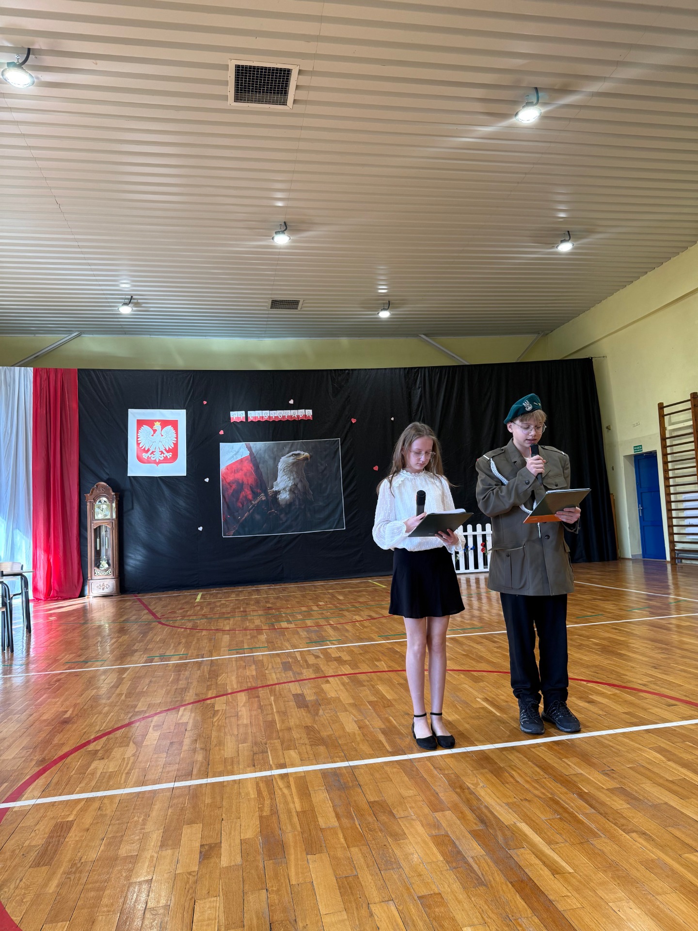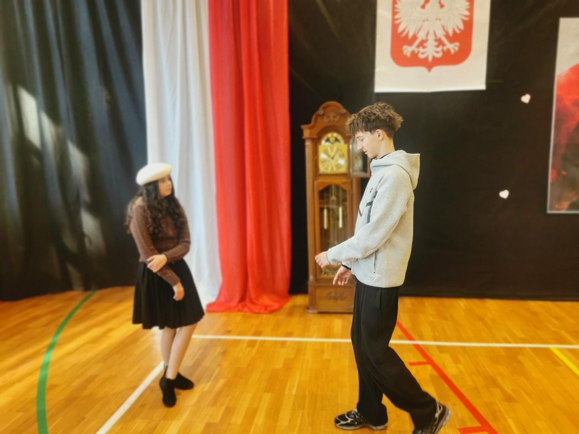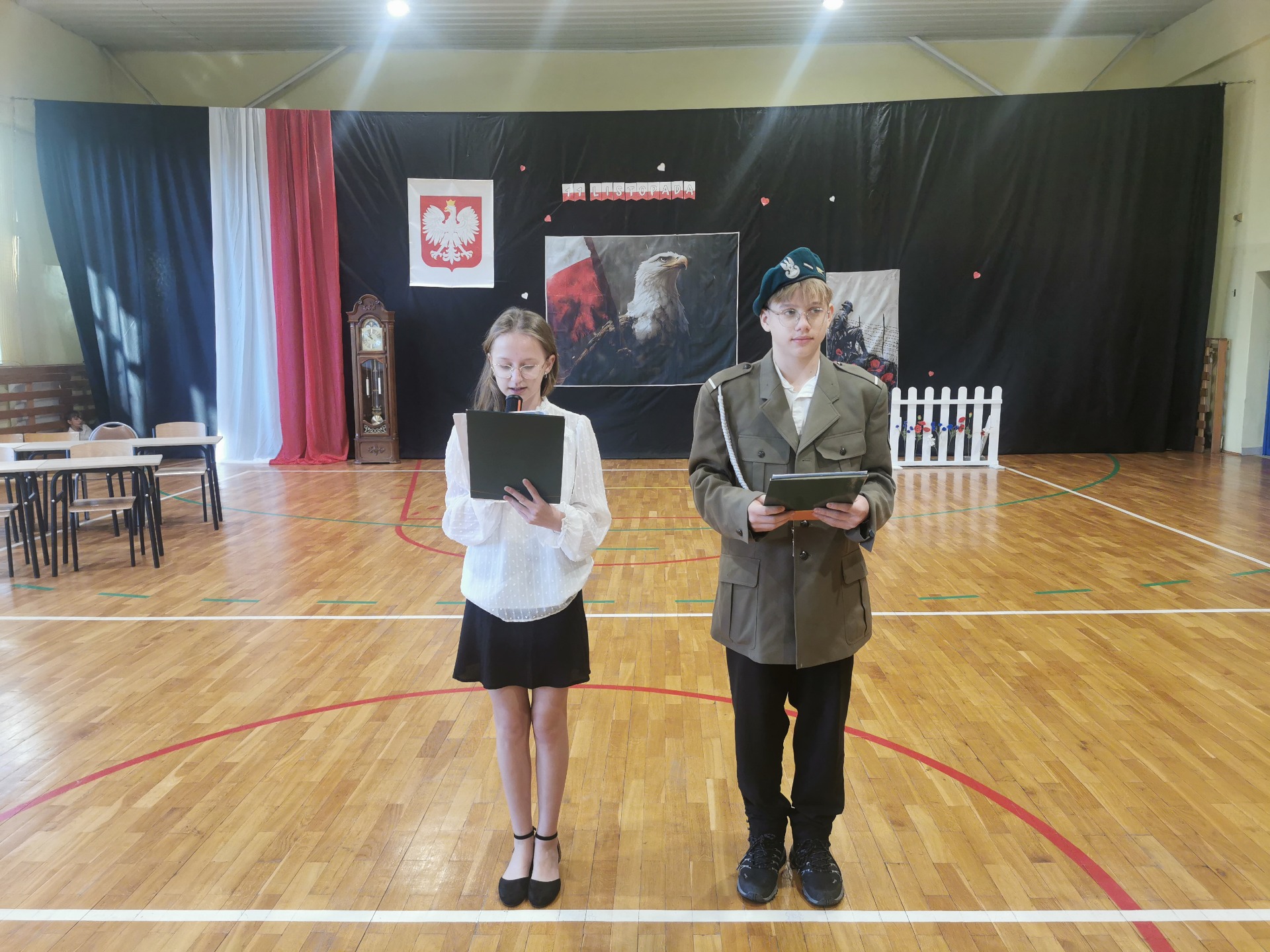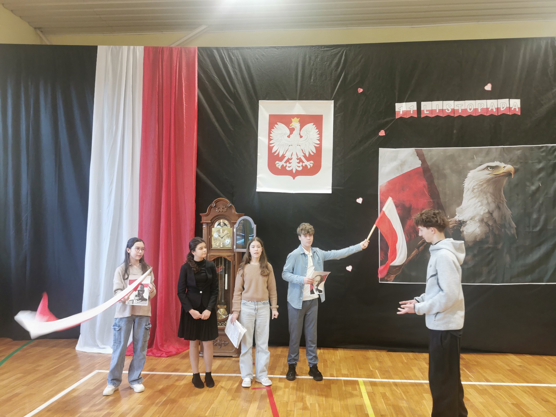 Podczas uroczystości uczniowie zaprezentowali wzruszające przedstawienie pt. „Zegar z Mazurkiem Dąbrowskiego”, które w piękny sposób przybliżyło historię odzyskania przez Polskę niepodległości. Scenki, pełne emocji i refleksji, przypomniały wszystkim, jak wiele zawdzięczamy tym, którzy walczyli o wolność naszego kraju.