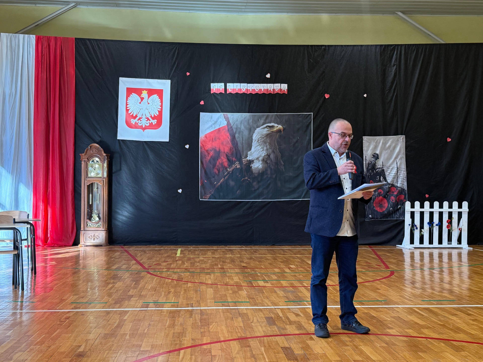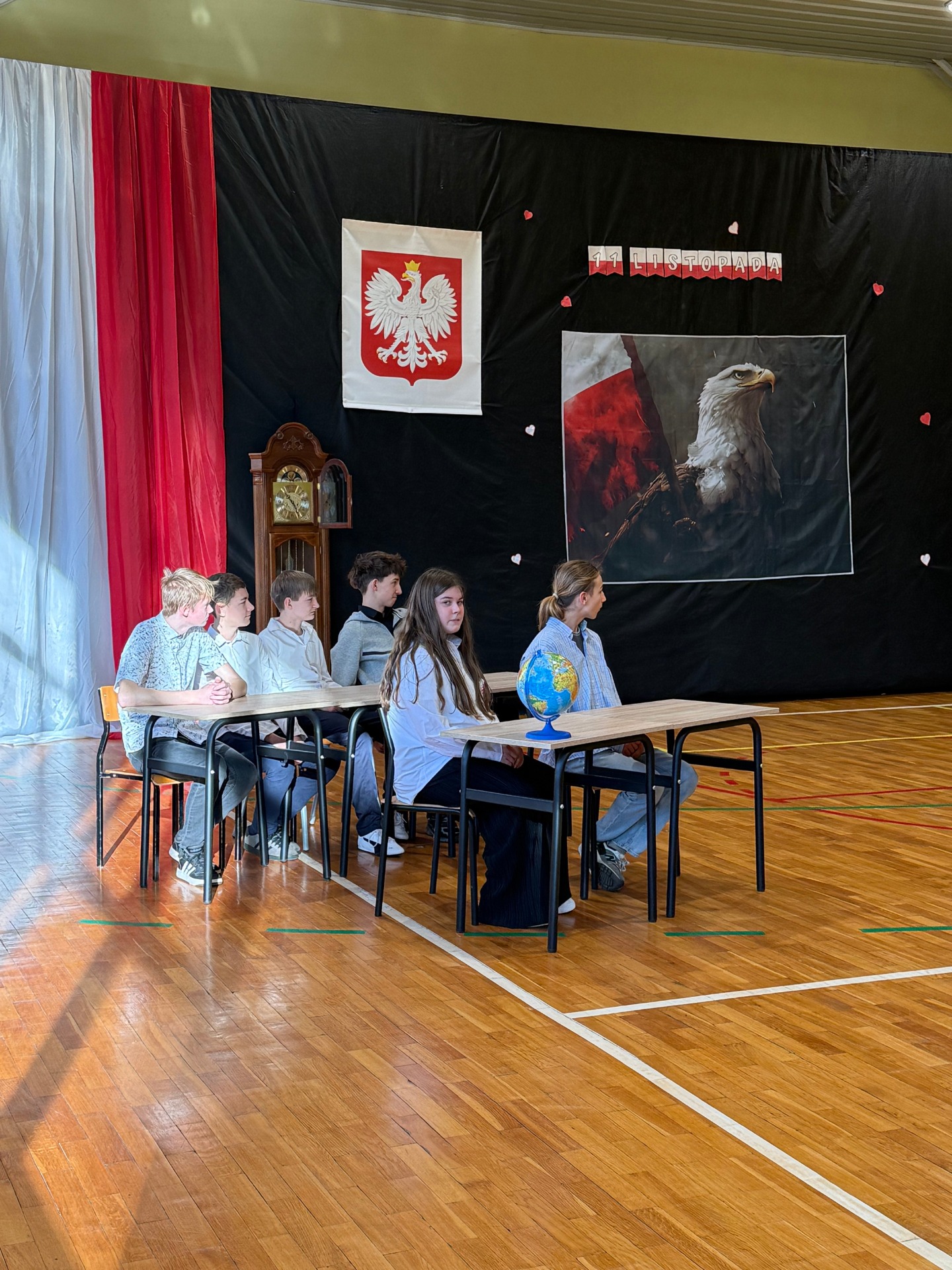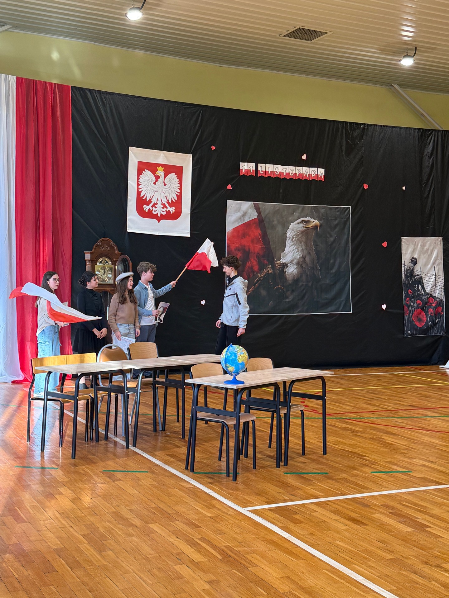 Podczas uroczystości uczniowie zaprezentowali wzruszające przedstawienie pt. „Zegar z Mazurkiem Dąbrowskiego”, które w piękny sposób przybliżyło historię odzyskania przez Polskę niepodległości. Scenki, pełne emocji i refleksji, przypomniały wszystkim, jak wiele zawdzięczamy tym, którzy walczyli o wolność naszego kraju.