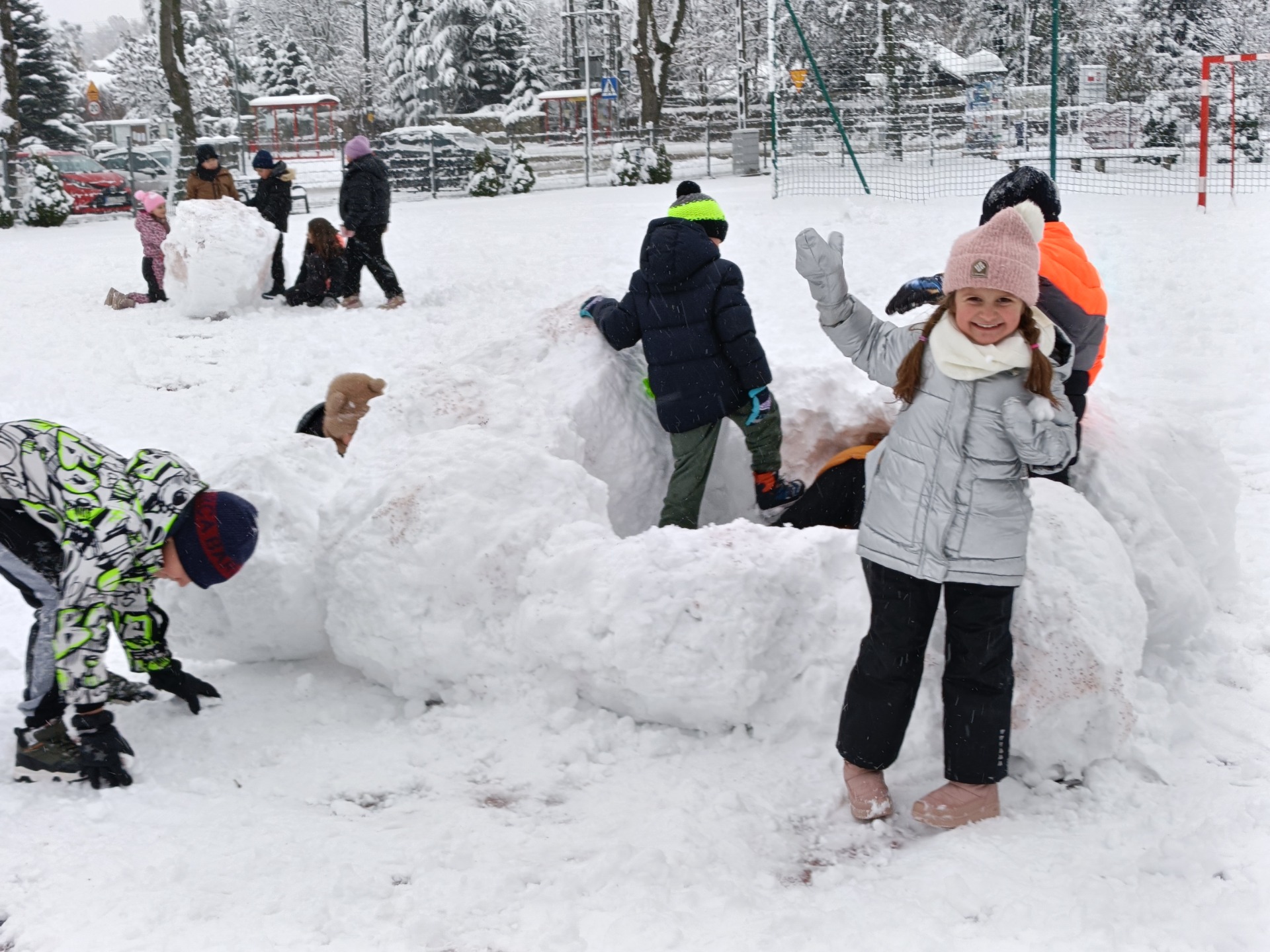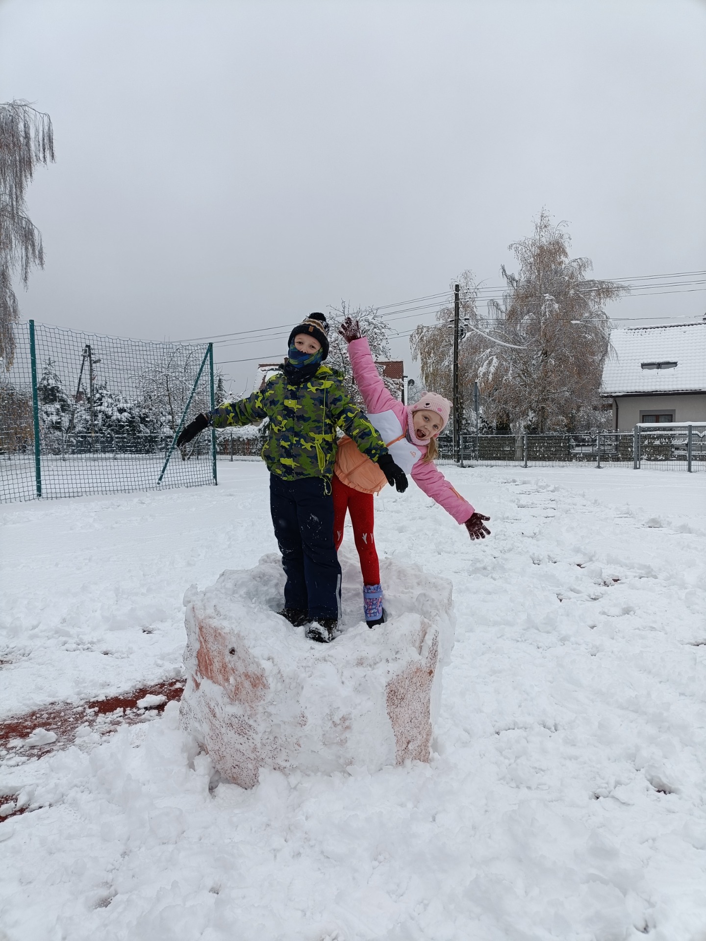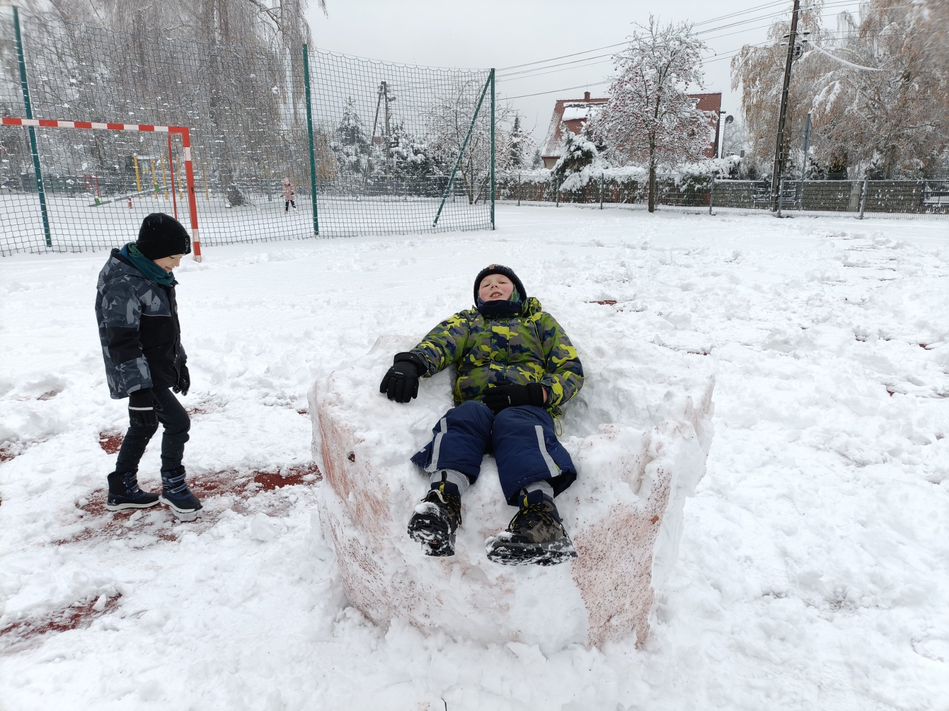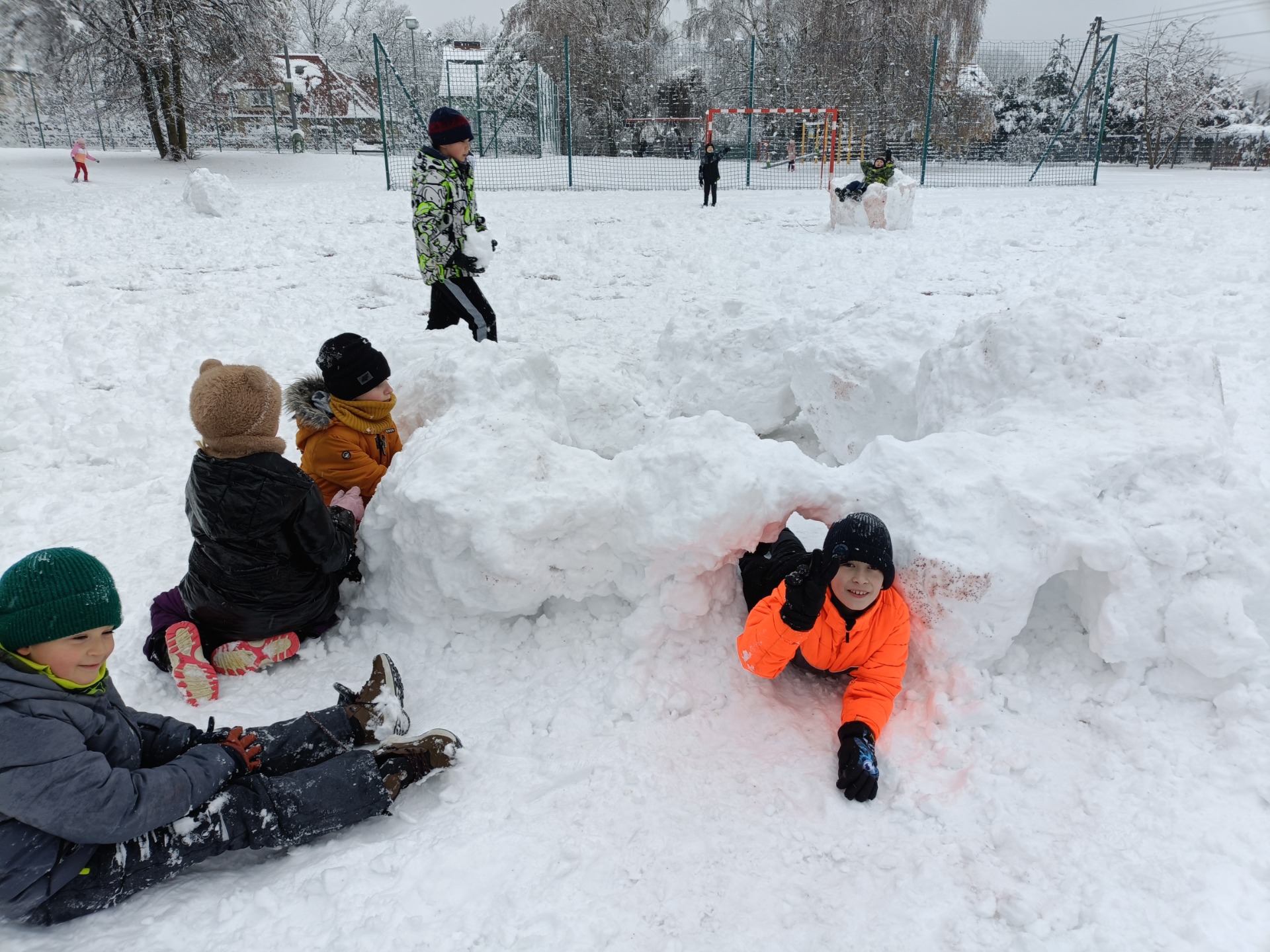 Pierwszy śnieg tej zimy sprawił dzieciom ogromną radość! Uczniowie chętnie skorzystali z okazji i bawili się na świeżym powietrzu. Powstały wspaniałe bałwany, igloo oraz ogromne