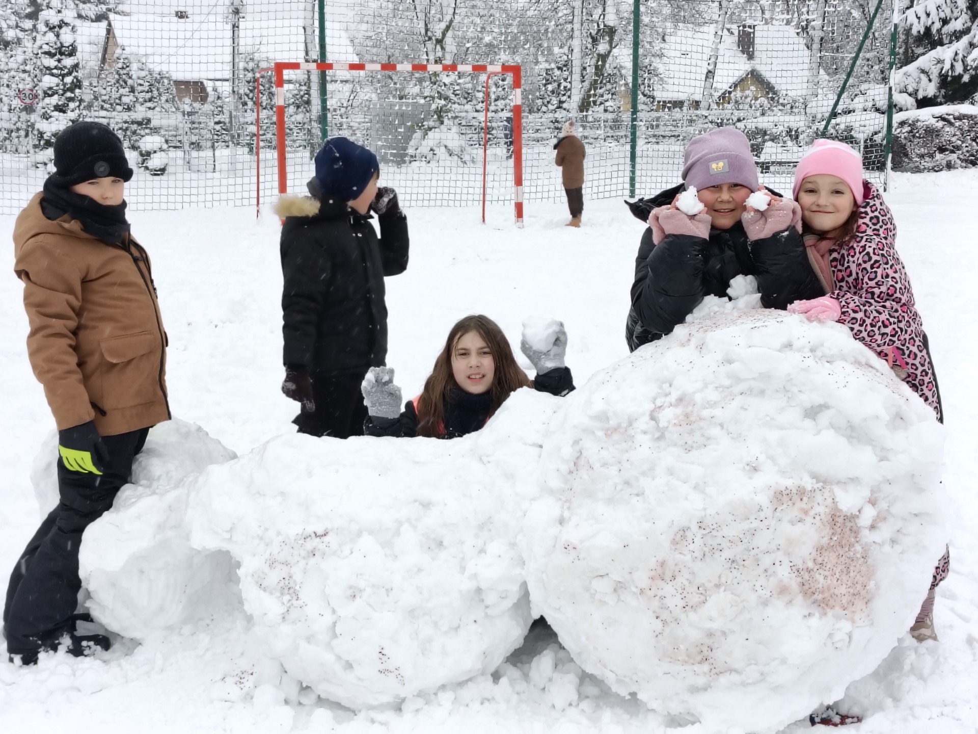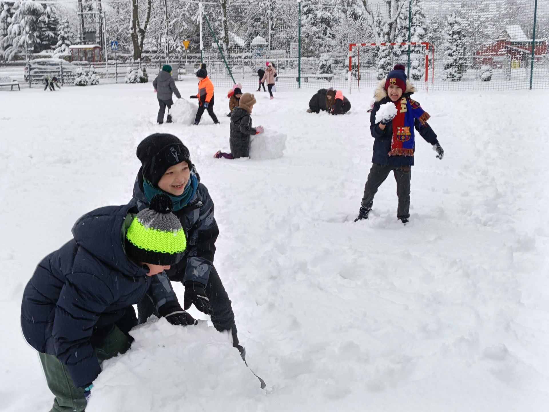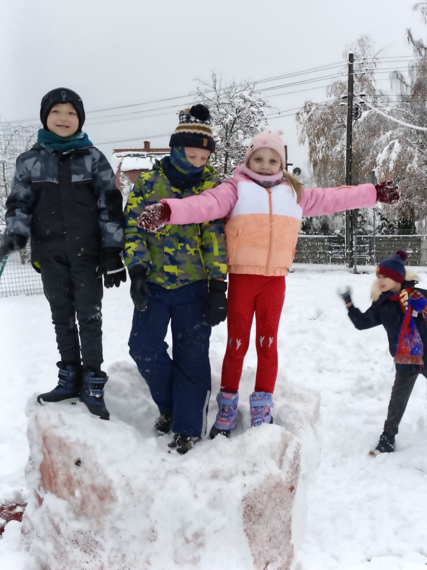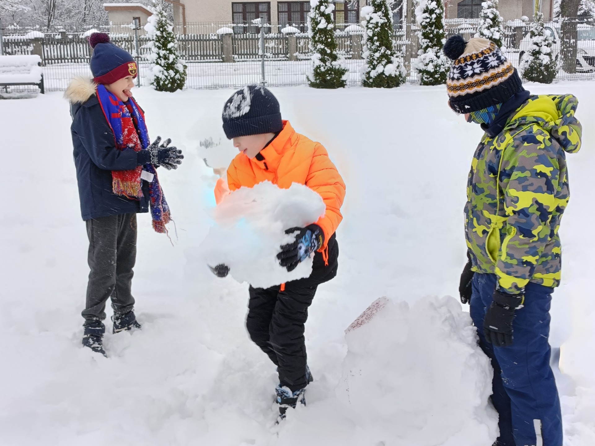 Pierwszy śnieg tej zimy sprawił dzieciom ogromną radość! Uczniowie chętnie skorzystali z okazji i bawili się na świeżym powietrzu. Powstały wspaniałe bałwany, igloo oraz ogromne