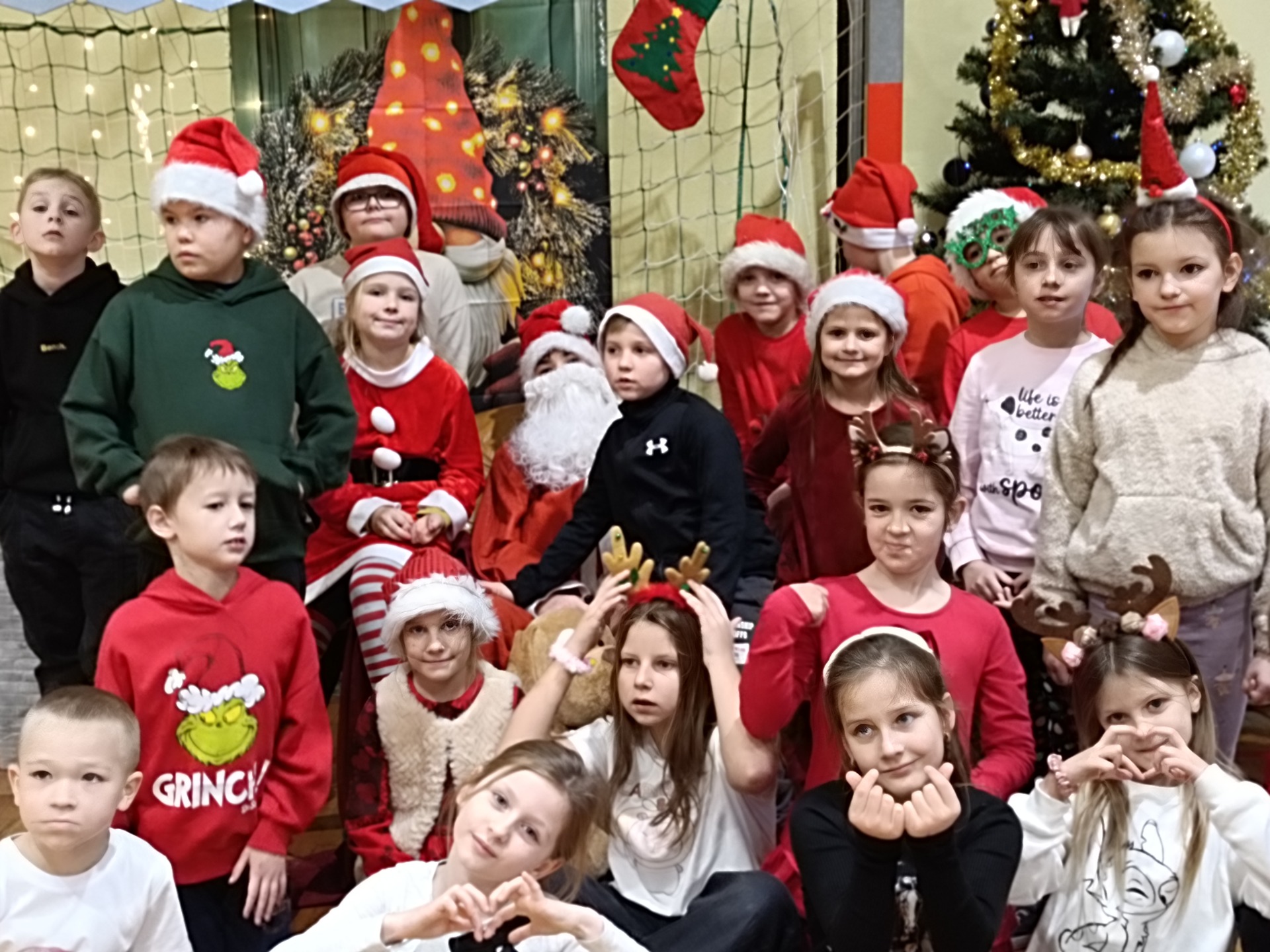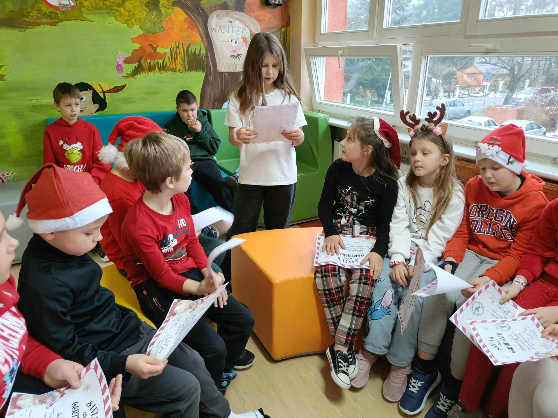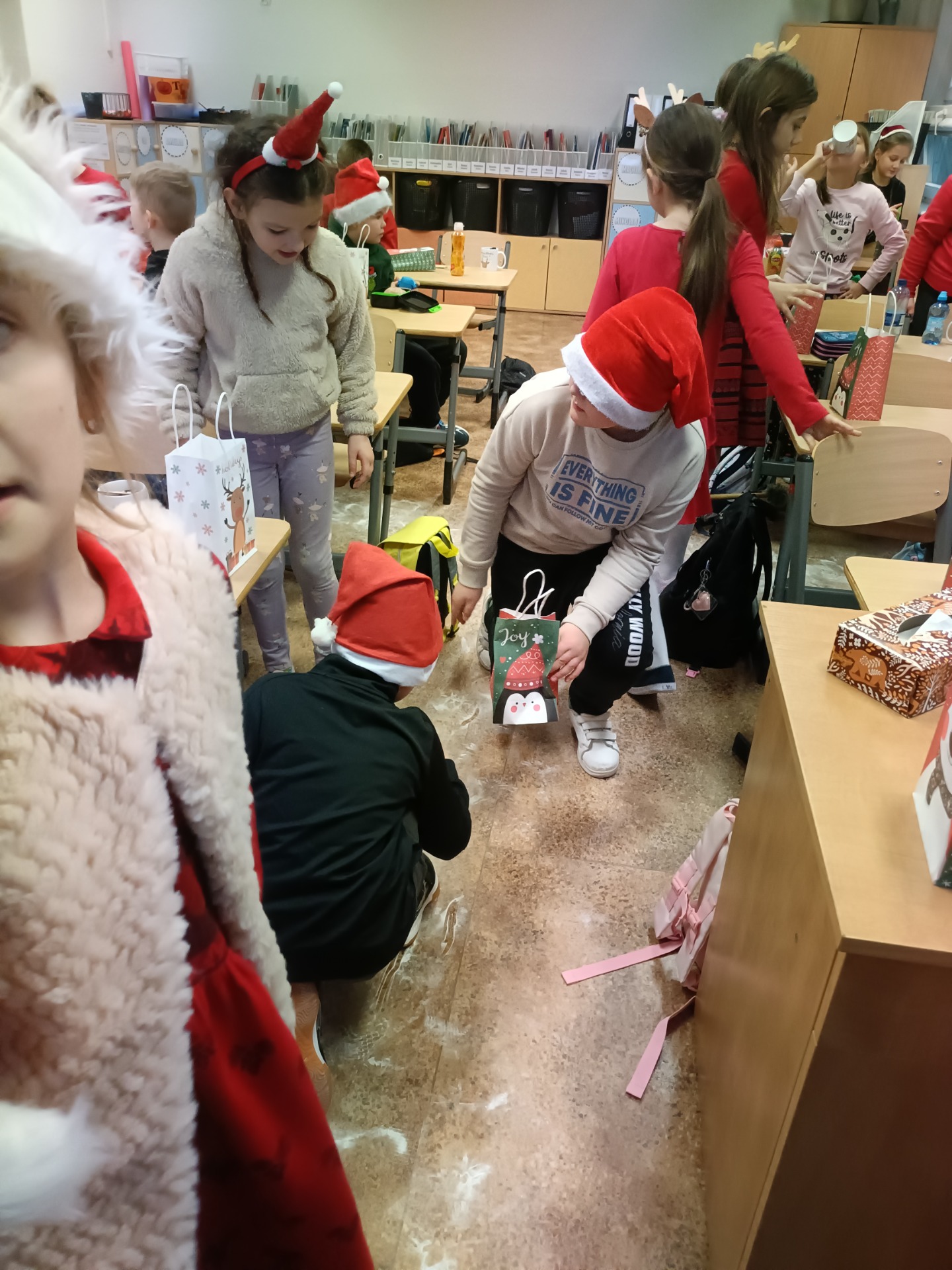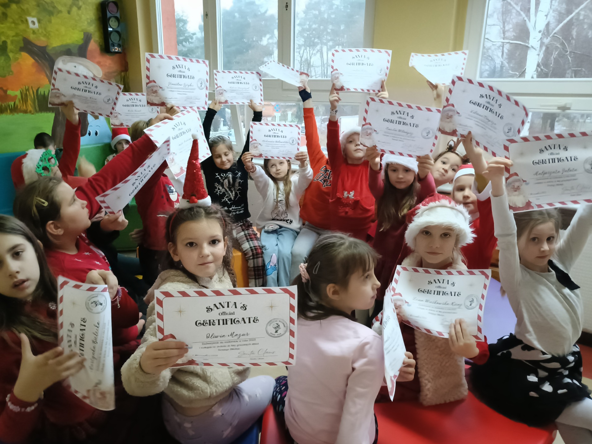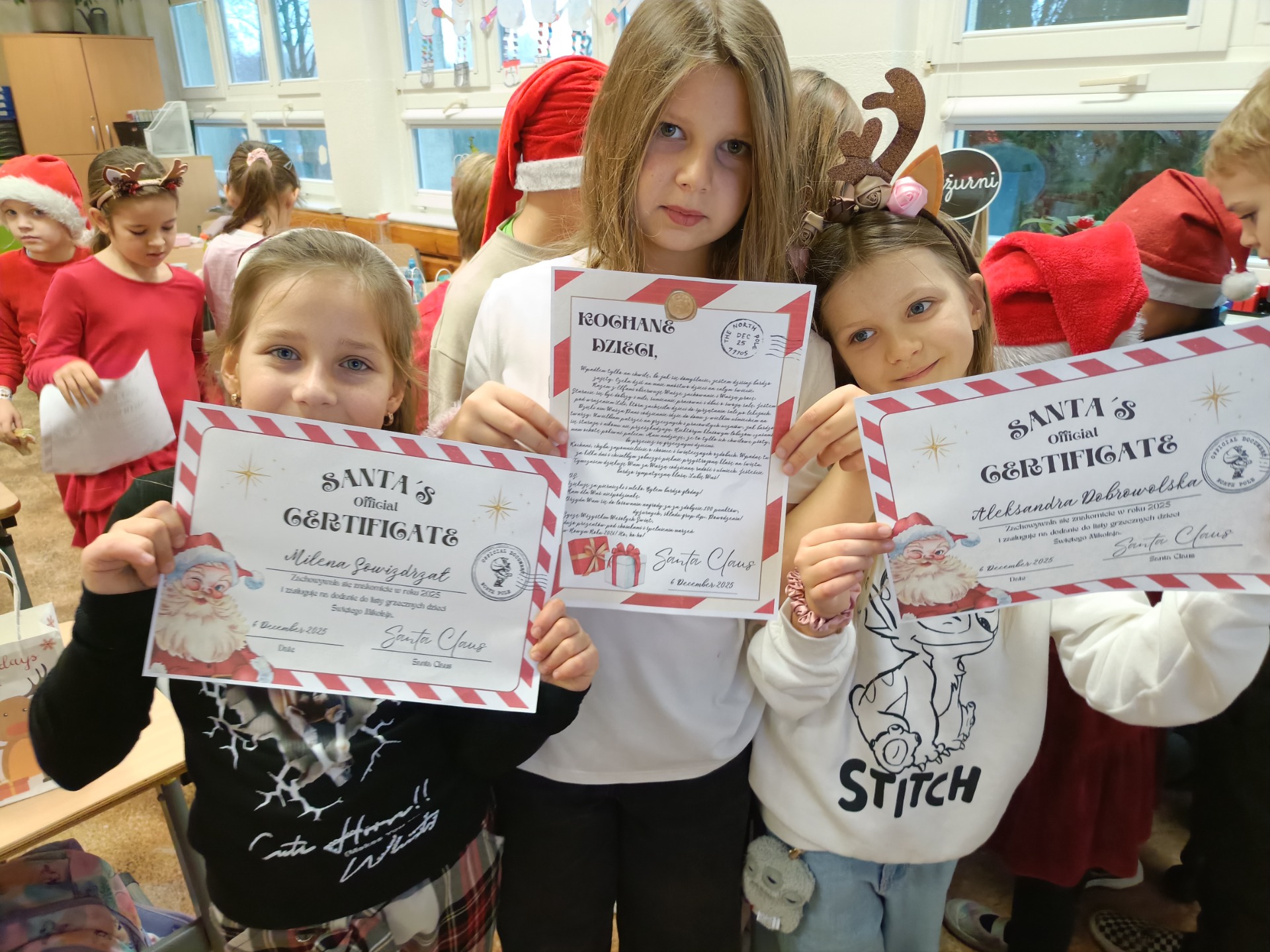 W drugiej klasie wydarzyło się coś naprawdę magicznego! Podczas, gdy dzieci świetnie bawiły się na zabawie mikołajkowej, do sali niepostrzeżenie zajrzał sam Święty Mikołaj! Zostawił po sobie mnóstwo niezwykłych śladów - na podłodze można było odnaleźć odbicia jego butów, a na jednej z ławek... odcisk dłoni! Dzieci szybko zauważyły, że z parapetu zniknęły pierniczki, które wcześniej przygotowały dla Mikołaja, a kubeczek z mlekiem był pusty. To mogło oznaczać tylko jedno — Mikołaj naprawdę tu był! Największa niespodzianka czekała pod czerwonym kocem. Tam właśnie ukrył prezenty dla każdego ucznia: kubeczki z imionami oraz świąteczne skarpetki, które wywołały mnóstwo radości i uśmiechów. Chwilę później pojawił się jeszcze list od Mikołaja, w którym dziękował dzieciom za ciepłe przywitanie i zostawione smakołyki. Każde dziecko otrzymało też Certyfikat Grzecznego Dziecka. Mikołaj poprosił drugoklasistów o piękne udekorowanie sali na święta i zdradził, że czeka na nich jeszcze jedna niespodzianka - jeśli wykonają jego zadanie. W klasie panowała niesamowita atmosfera, pełna radości, zachwytu i świątecznej magii. Ten dzień na długo pozostanie w pamięci naszych małych uczniów!