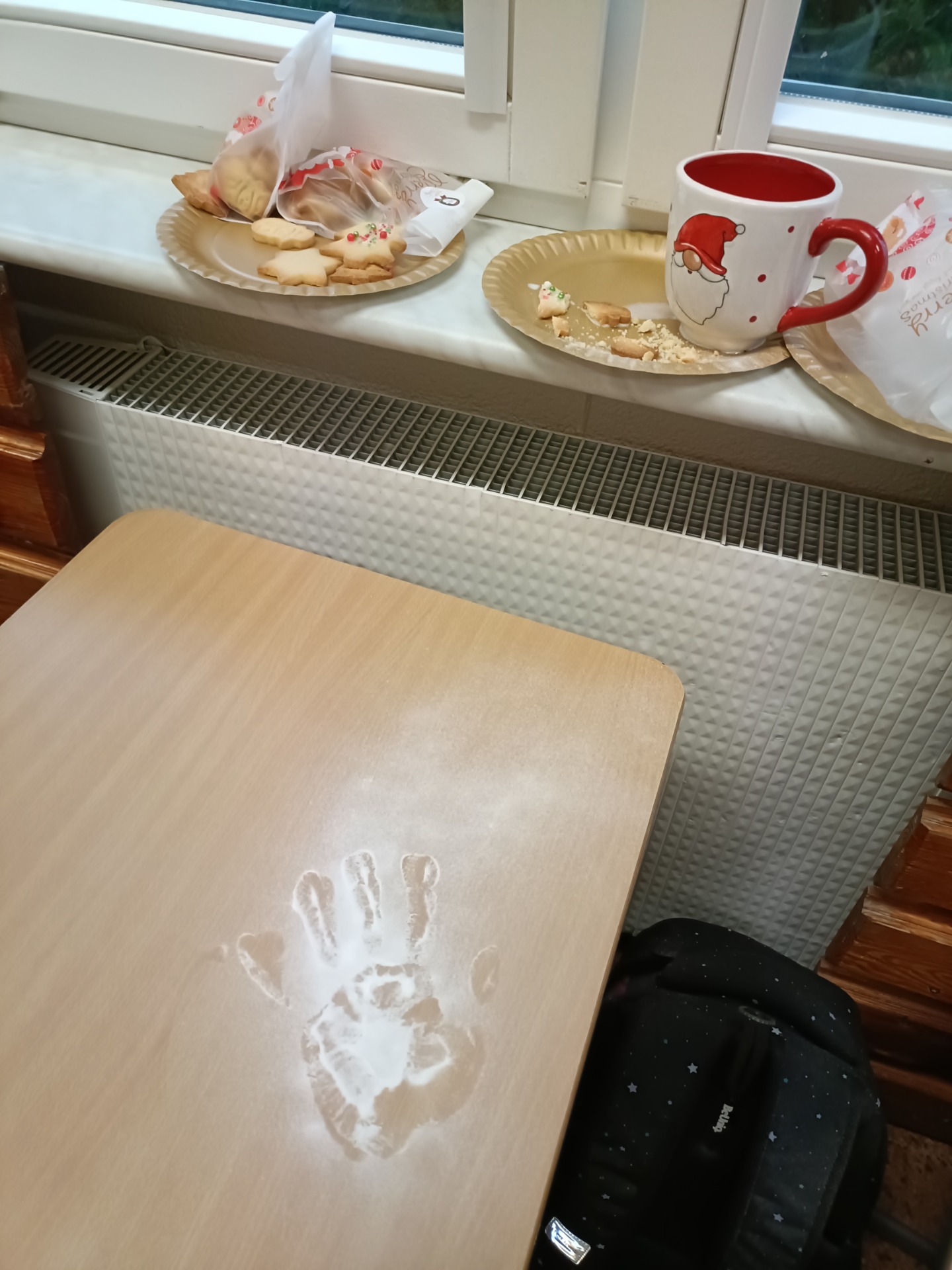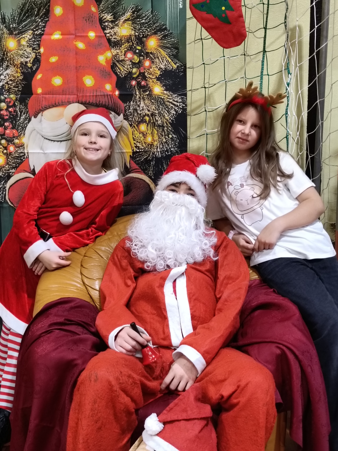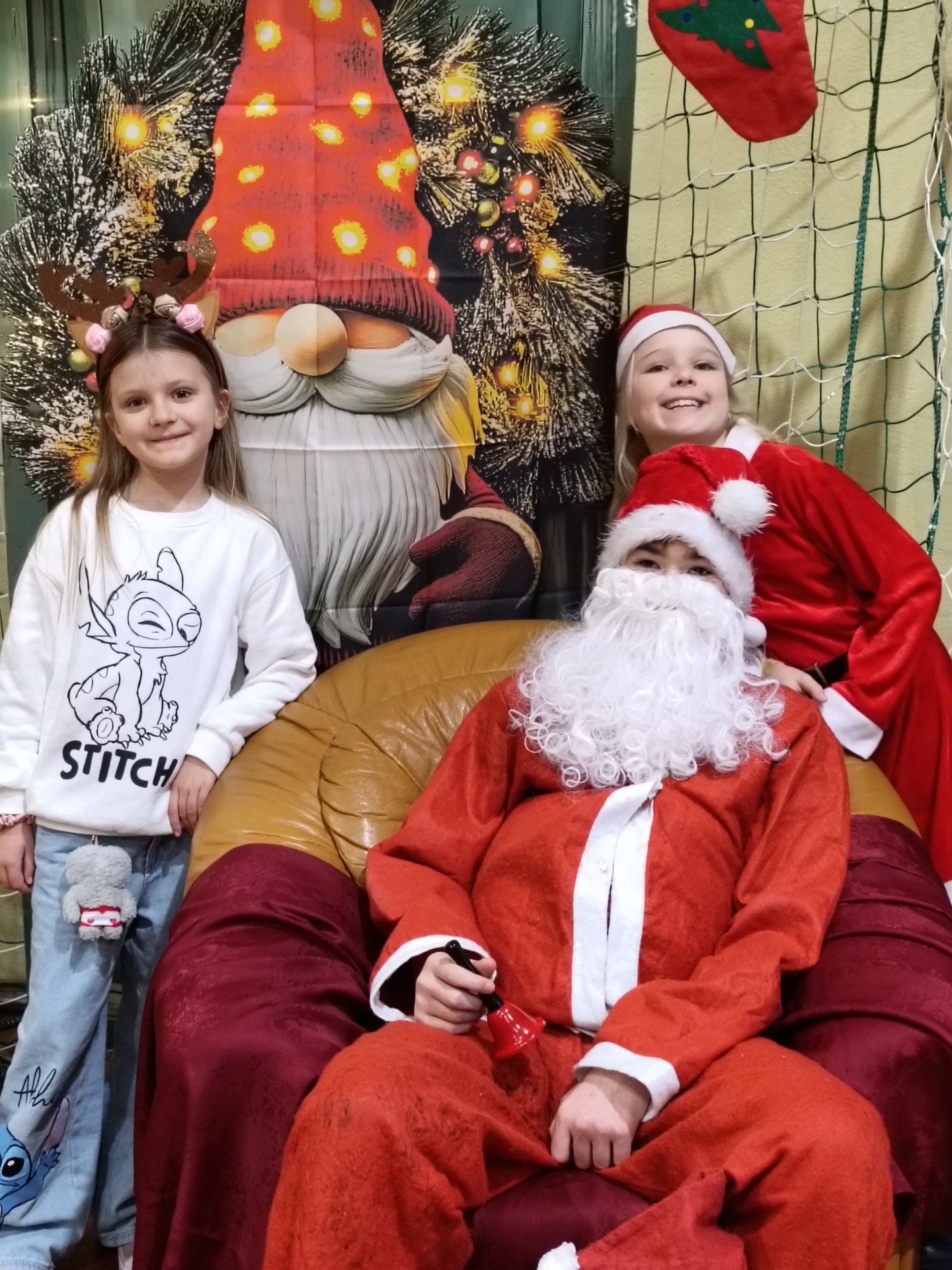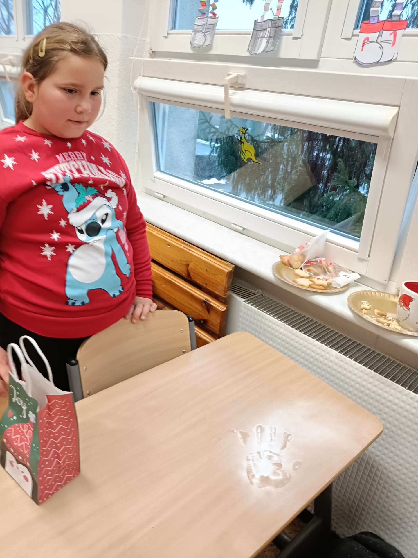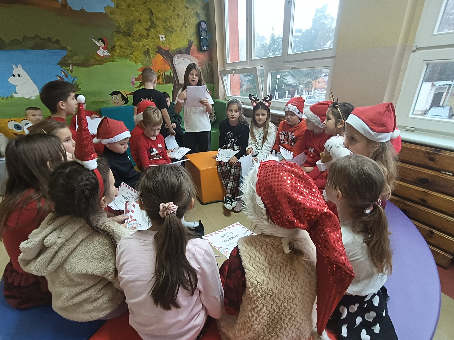 W drugiej klasie wydarzyło się coś naprawdę magicznego! Podczas, gdy dzieci świetnie bawiły się na zabawie mikołajkowej, do sali niepostrzeżenie zajrzał sam Święty Mikołaj! Zostawił po sobie mnóstwo niezwykłych śladów - na podłodze można było odnaleźć odbicia jego butów, a na jednej z ławek... odcisk dłoni! Dzieci szybko zauważyły, że z parapetu zniknęły pierniczki, które wcześniej przygotowały dla Mikołaja, a kubeczek z mlekiem był pusty. To mogło oznaczać tylko jedno — Mikołaj naprawdę tu był! Największa niespodzianka czekała pod czerwonym kocem. Tam właśnie ukrył prezenty dla każdego ucznia: kubeczki z imionami oraz świąteczne skarpetki, które wywołały mnóstwo radości i uśmiechów. Chwilę później pojawił się jeszcze list od Mikołaja, w którym dziękował dzieciom za ciepłe przywitanie i zostawione smakołyki. Każde dziecko otrzymało też Certyfikat Grzecznego Dziecka. Mikołaj poprosił drugoklasistów o piękne udekorowanie sali na święta i zdradził, że czeka na nich jeszcze jedna niespodzianka - jeśli wykonają jego zadanie. W klasie panowała niesamowita atmosfera, pełna radości, zachwytu i świątecznej magii. Ten dzień na długo pozostanie w pamięci naszych małych uczniów!