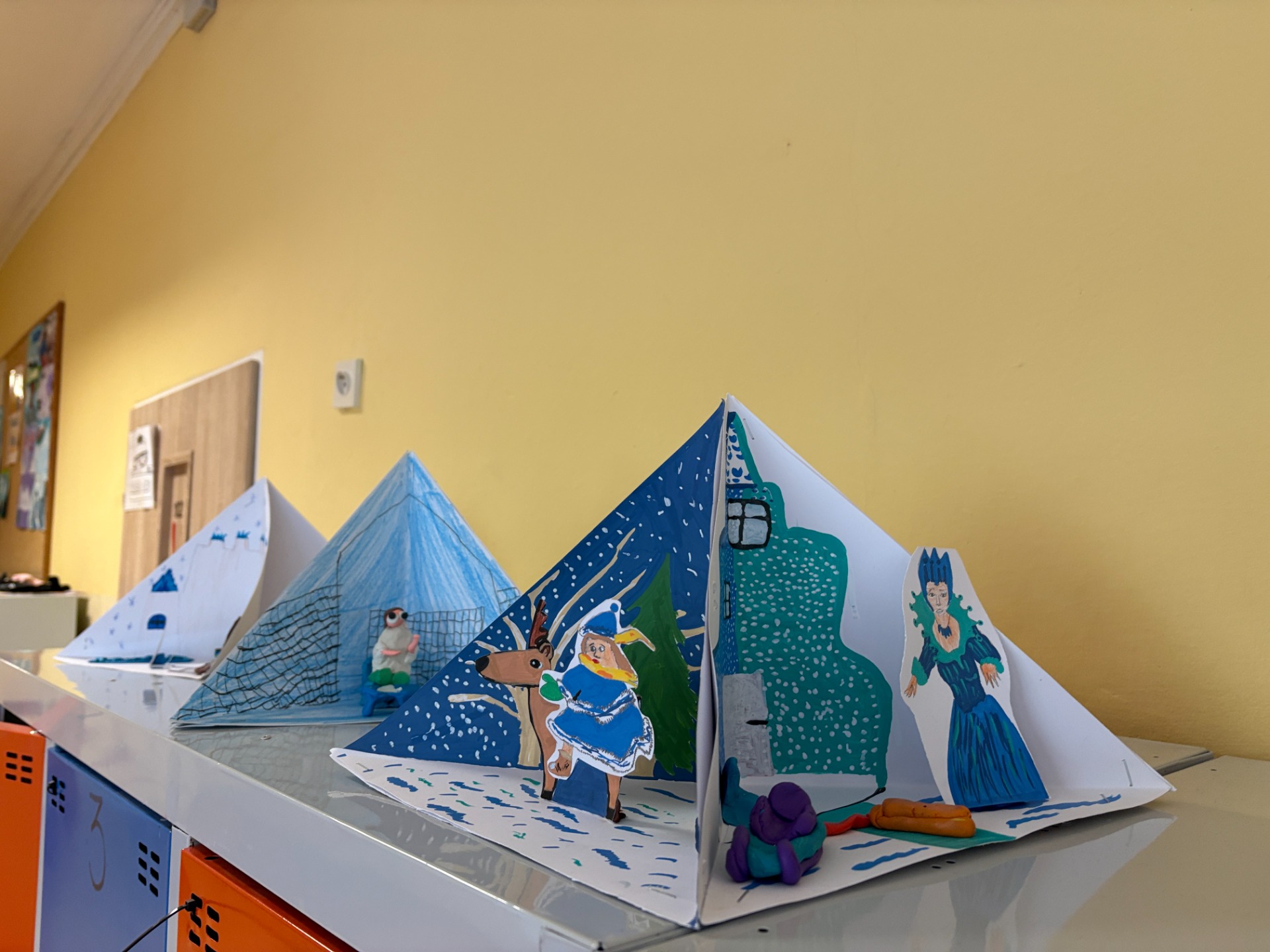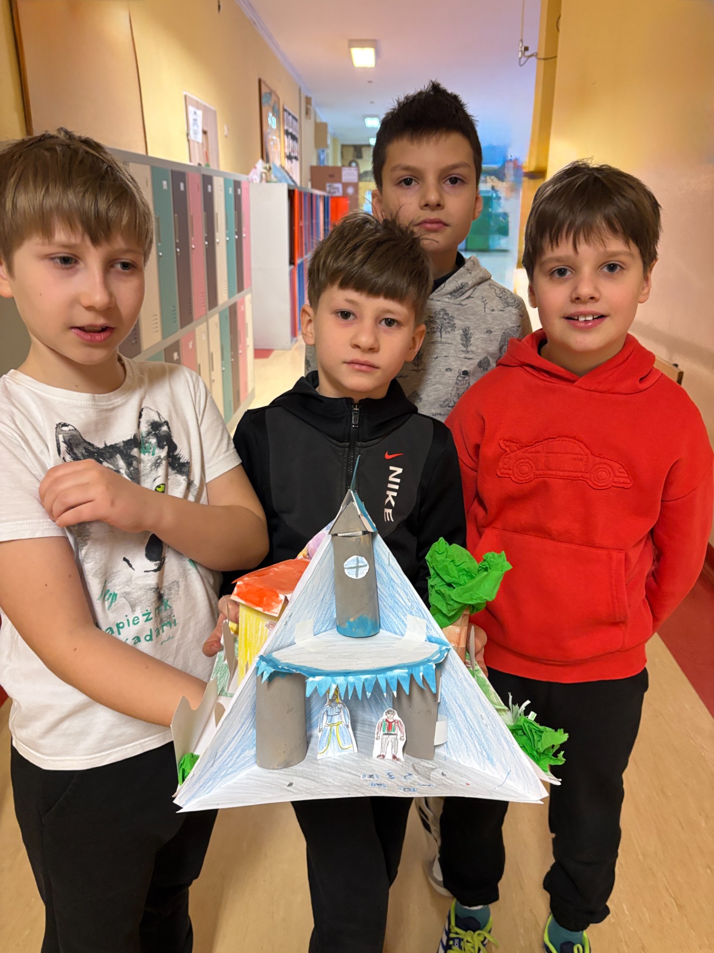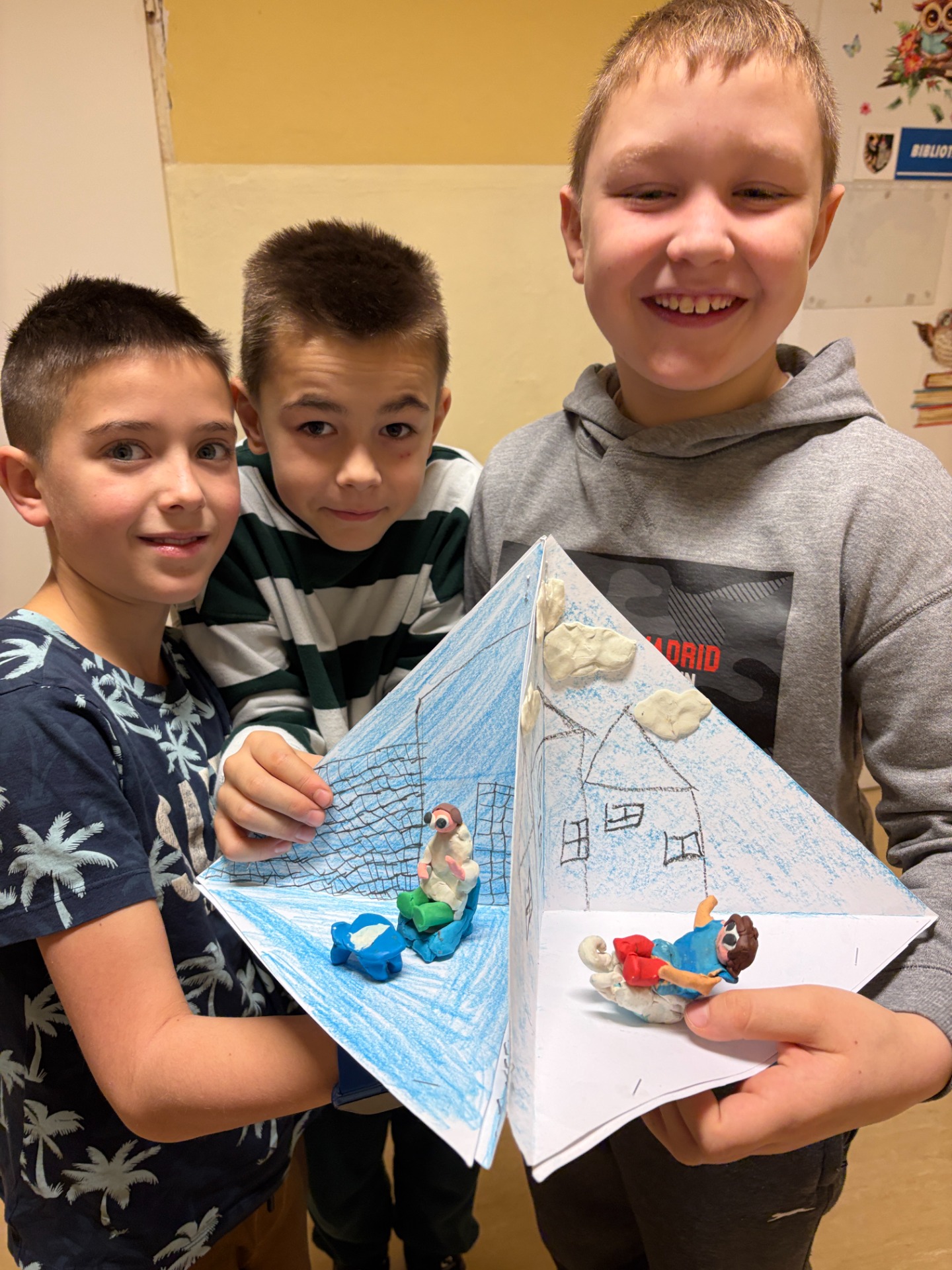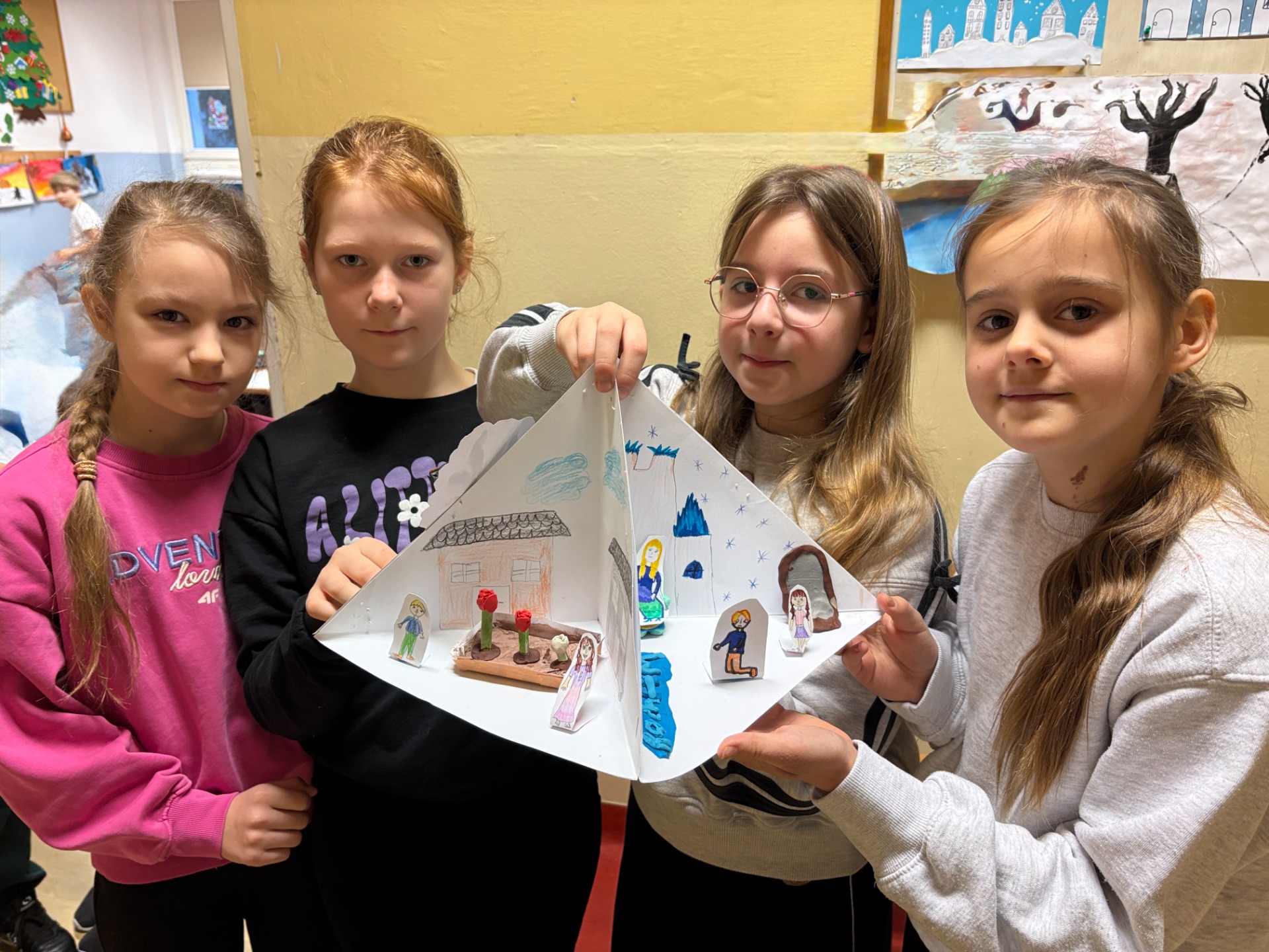 Uczniowie klasy 3 b przeczytali piękną baśń H. Ch. Andersena “Królowa Śniegu”. Po jej omówieniu wykonali w grupach trioramy, czyli prace plastyczne w formie trójwymiarowych scenek. Składają się one z trzech połączonych ścian, które tworzą przestrzeń – małą scenografię. Każda ze ścianek przedstawia bohaterów, miejsca i wydarzenia z lektury.